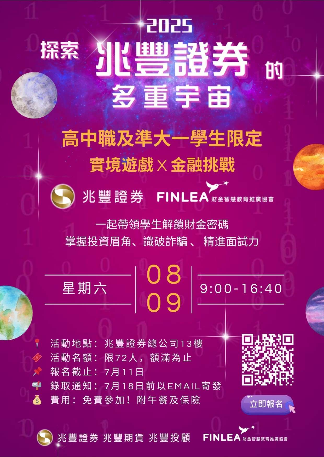 一、為落實金融教育向下扎根,並協助青年學子提升財金素養及風險意識,兆豐證券與社團法人中華民國財金智慧教育推廣 協會特規劃於114年8月9日於本公司總部辦理第三屆「探索兆豐 證券的多重宇宙」主題營隊。