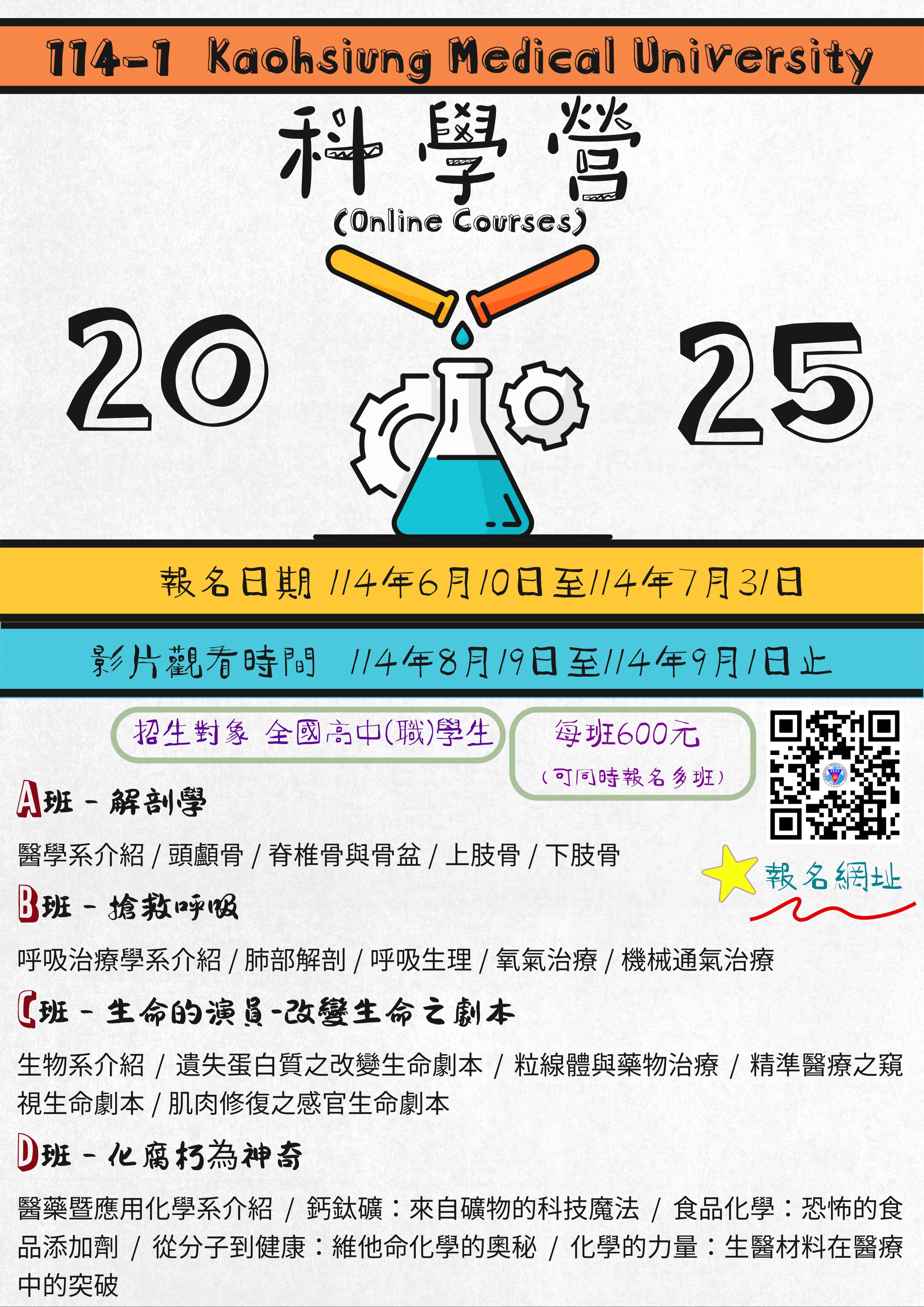高雄醫學大學自114年8月19日(星期二)起辦理「114-1高醫科學營」線上課程,旨在協助高中職學生認識醫學相關知識及該校特色,營隊相關資訊如下: