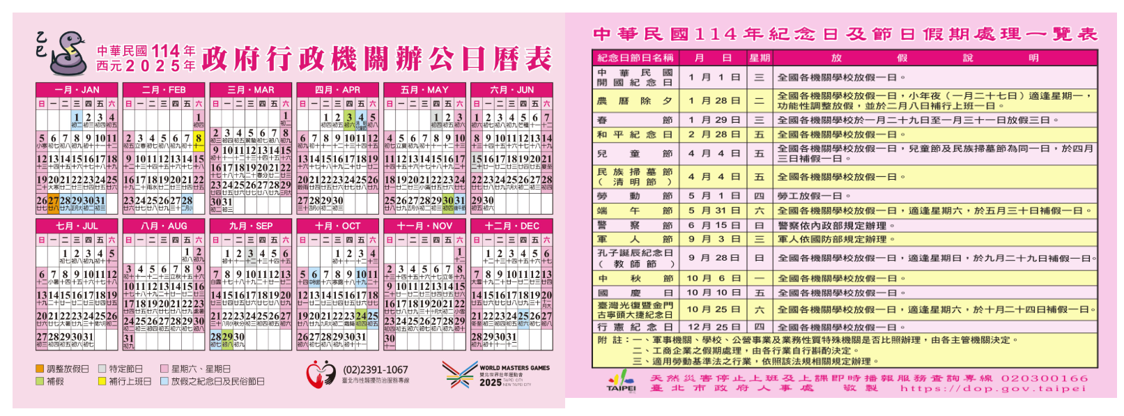三、本府「114年政府行政機關辦公日曆表」已配合旨揭辦公日曆表修正,電子檔並登載於本府人事處全球資訊網,各機關同仁如有需要,請自行下載使用,基於節能減碳政策及撙節經費,不再重行印製。