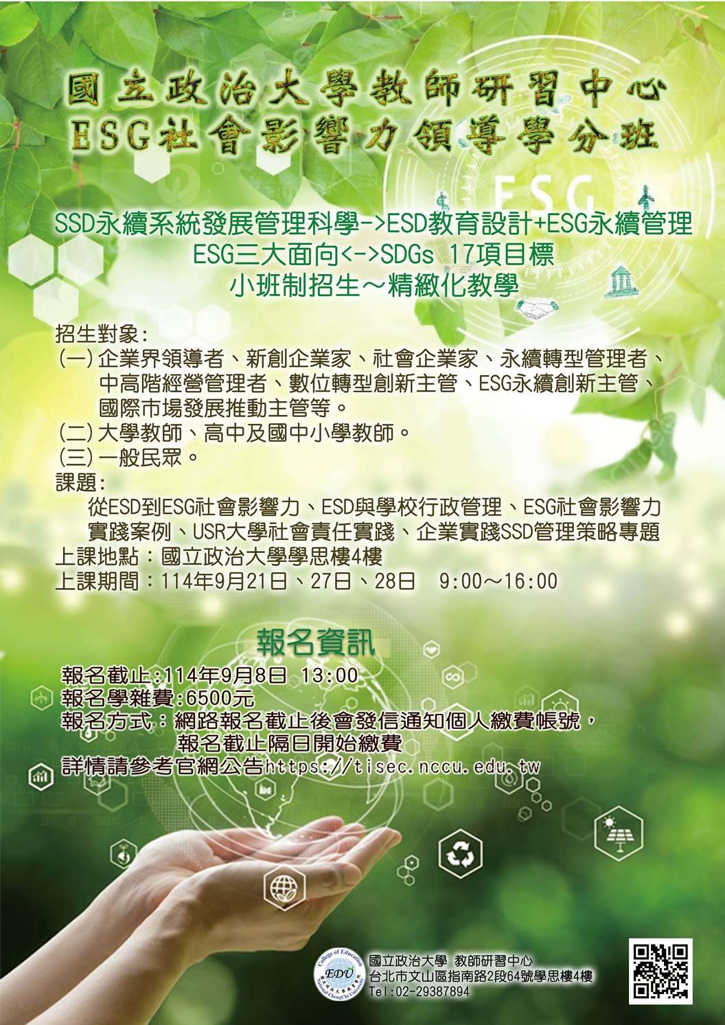 轉知國立政治大學教師研習中心辦理「114年度ESG社會影響力領導 學分班」簡章