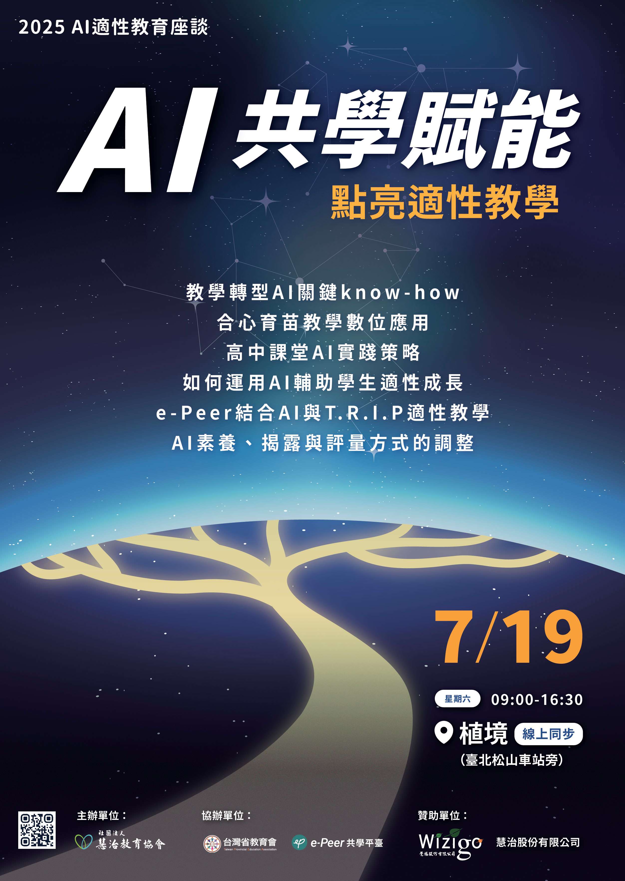 (一)社團法人慧治教育協會於暑假期間辦理「2025 AI適性教育座談」,以「AI共學賦能,點亮適性教學」為主題, 聚焦本會推動之適性引導理念與AI科技應用,並結合T. R.I.P.適性教學模式架構。本活動邀請專家學者與第一 線教師,分享AI實務應用趨勢與教學案例,並導入ePeer共學平臺,引導教師善用AI工具進行教學優化。期望藉由AI科技提升教師教學效能,促進專業社群互動, 深化適性教學實踐,點亮每一位孩子的學習之路。