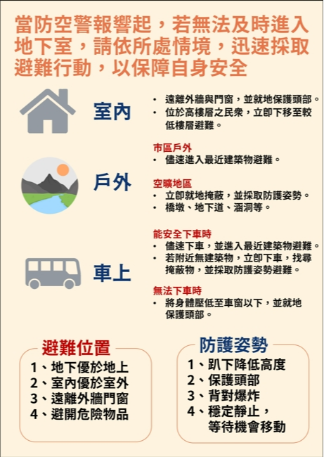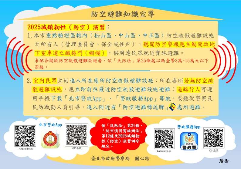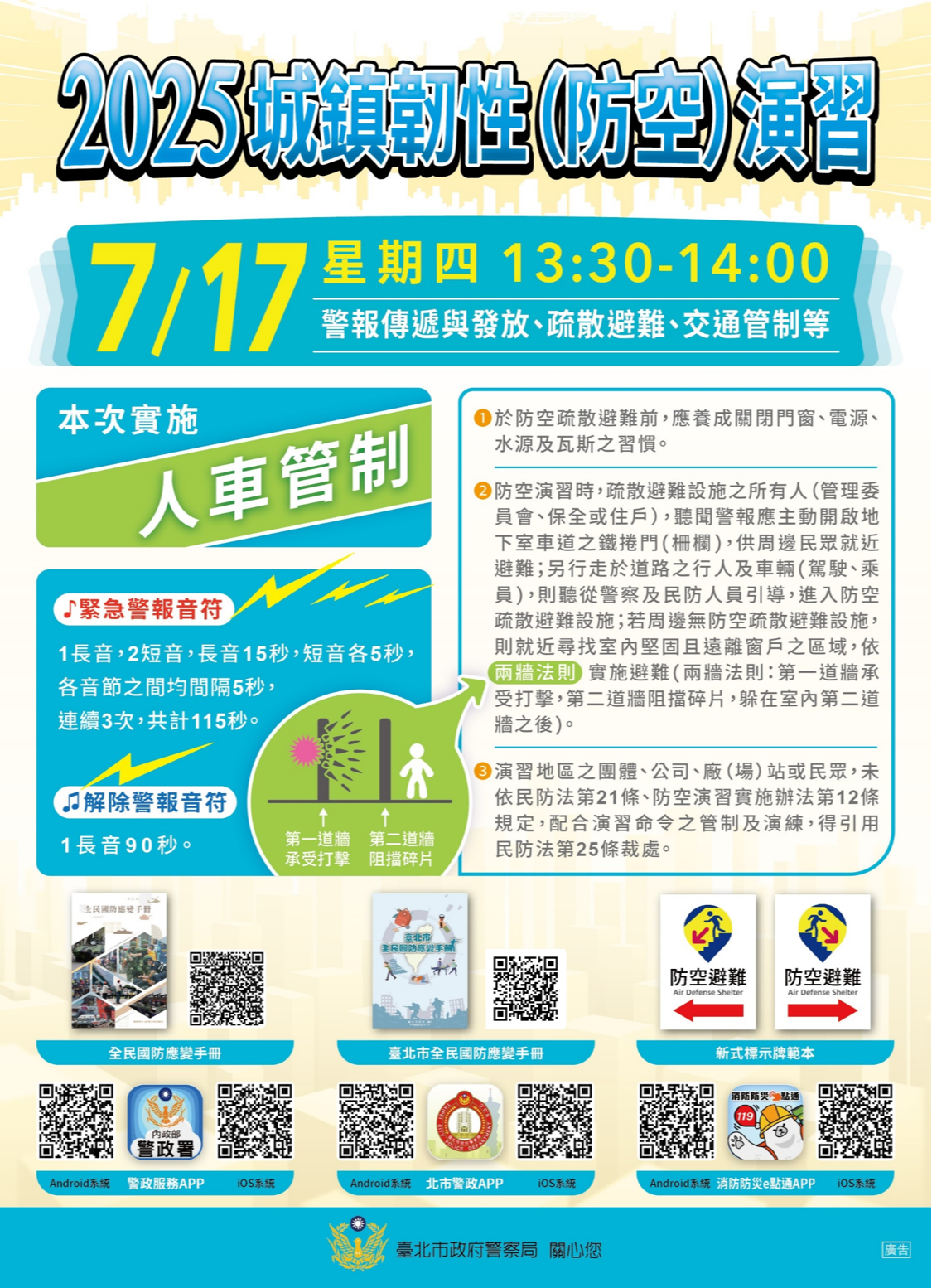 三、本市2025城鎮韌性(防空)演習將於114年7月17日實施全面、務實演練,為協助民眾於防空警報發布時,能依所在情境採取適切行 動,確保個人安全,請各機關學校配合於「 2025城鎮韌性(防空)演習」(114年7月17日)前及後續適合宣導場合,加強推廣本避難指引,俾利民眾於極端狀況時即時應 變。