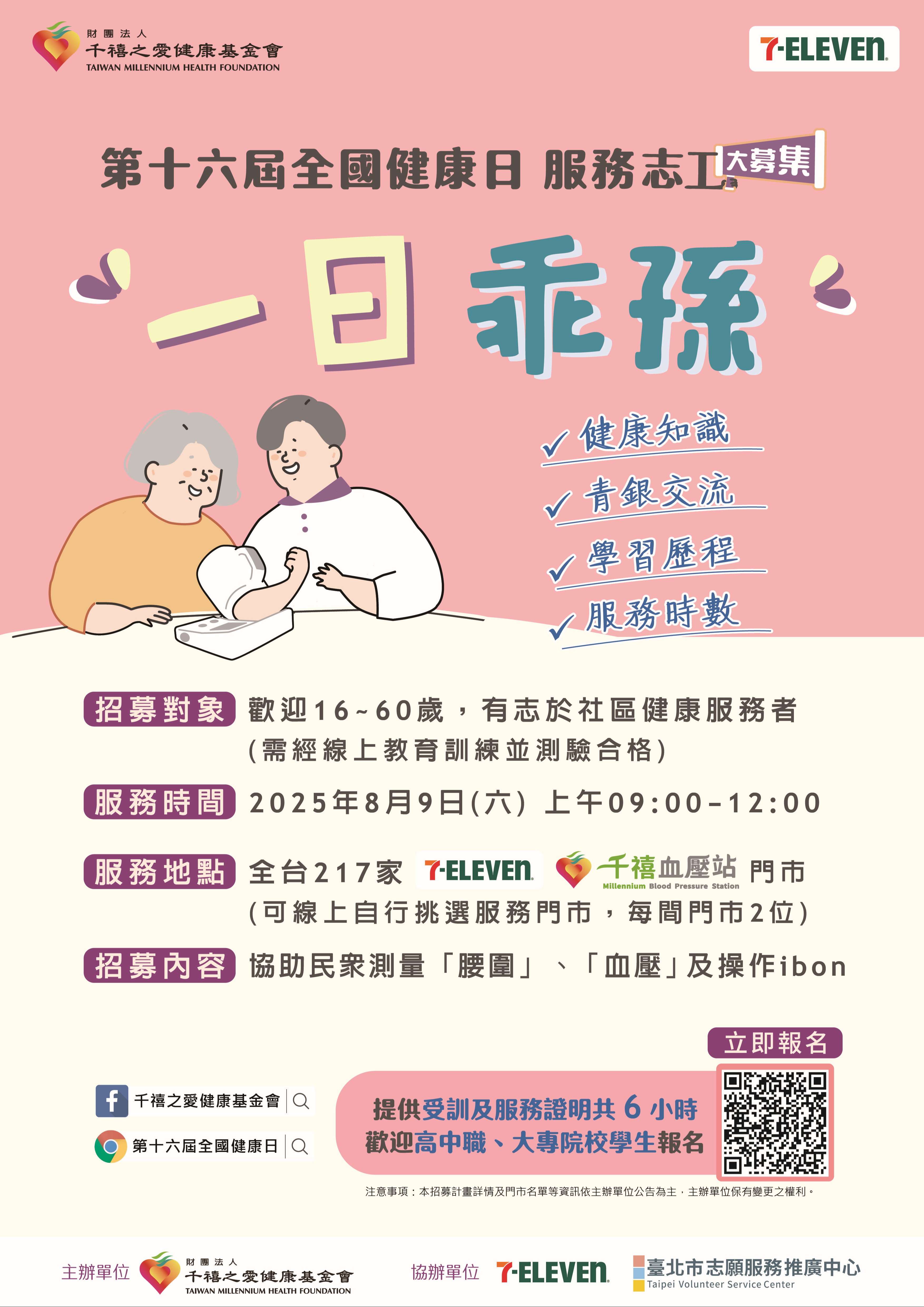 千禧之愛健康基金會辦理「2025全國健康日」乖孫志工召募,邀請有興趣青年學生共同參與,活動採網路報名,相關資訊請洽https://reurl.cc/XQ4Gaj。檢附活動海報