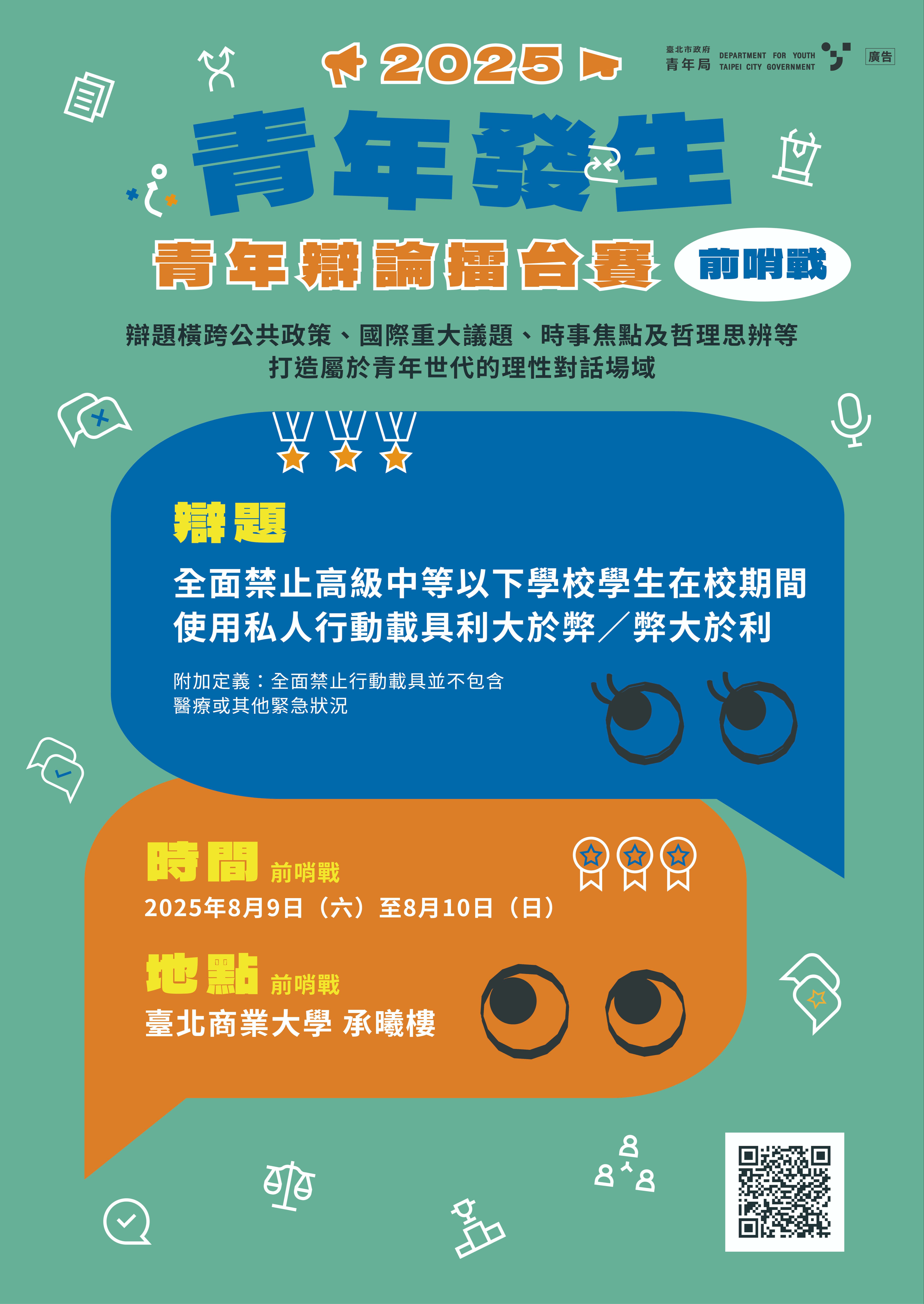 二、本次競賽預計於114年(以下同)8月9日、8月10日舉辦前哨戰競賽,討論主題為「全面禁止高級中等以下學校學生 在校期間使用私人行動載具,利大於弊/弊大於利」,歡迎關心相關議題討論之青年朋友及一般民眾踴躍觀賽,活動說明如下: (一)活動日期:8月9日(星期二)、8月10日(星期三)。 (二)活動地點:國立臺北商業大學承曦樓5樓(臺北市中正區 濟南路一段321號)。 (三)參加對象:關心議題之青年朋友及一般民眾,無須報