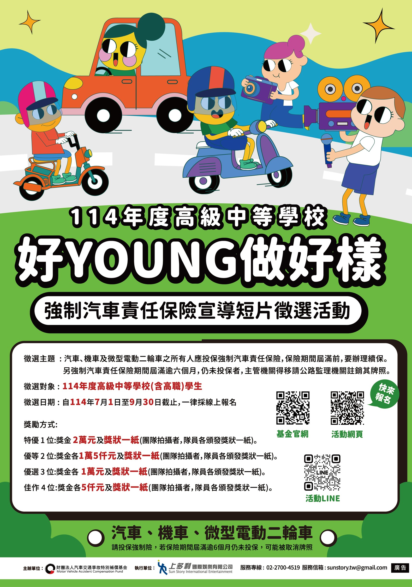 強制汽車責任保險宣導短片徵選活動,鼓勵學生踴躍報名參加。