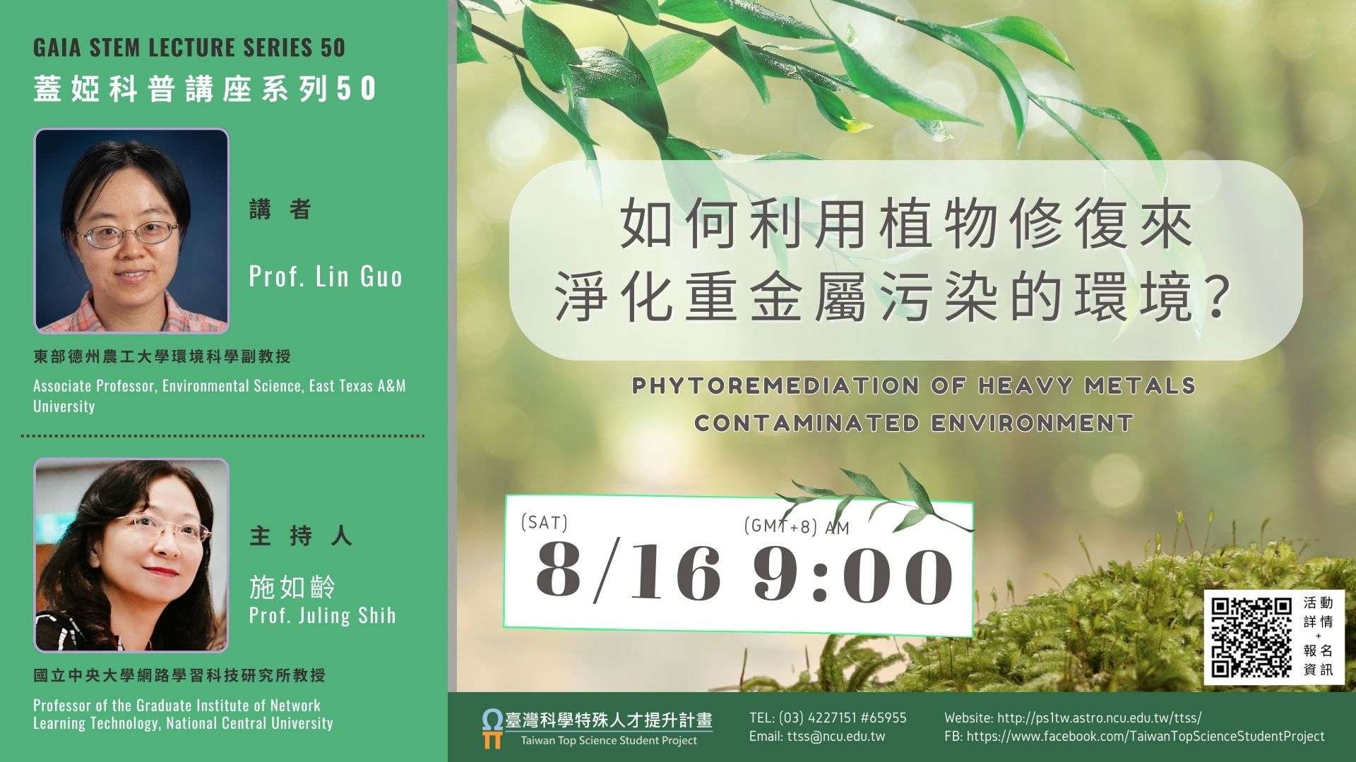 一、本次講座邀請到東部德州農工大學的Prof. Lin Guo主講。 Prof. Guo 的研究興趣包含土壤復育、廢水處理與空氣污 染管制等,其中植物修復是她主要的研究領域之一。植物 修復是將土壤、水或空氣中的污染物,使用植物來去除、 破壞或隔離,並恢復受污染的環境。本次演講將帶我們了解植物如何淨化環境中的污染,展現綠色科技的潛能。
