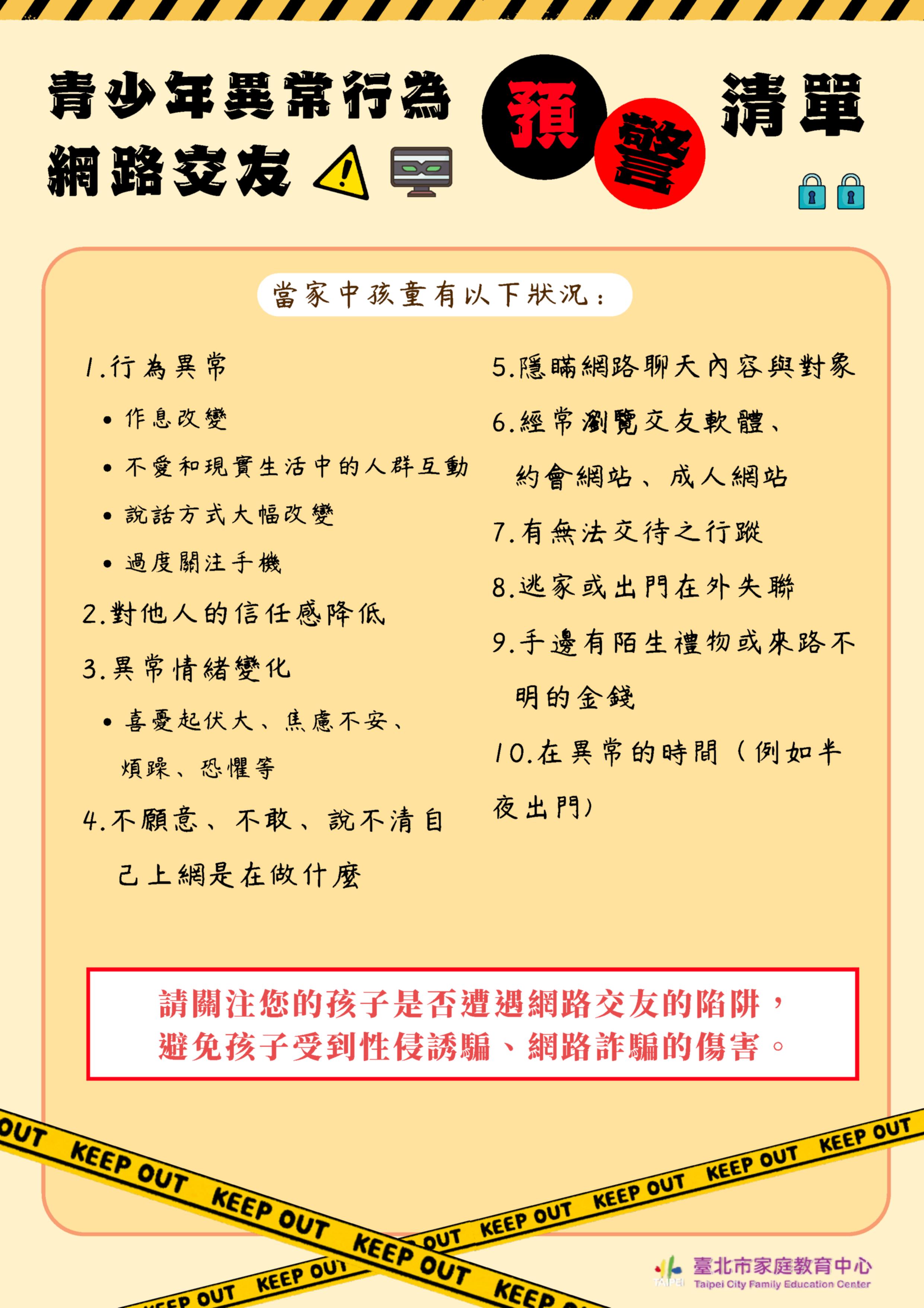 說明:一、為協助家長關心數位環境對青少年的風險,面對「網路交友」與「性侵誘騙」的陷阱,平時應建立良好的親子關係,海報內容列有10項實用之網路交友警訊,以察覺孩子是否已陷入網路交友的困境。