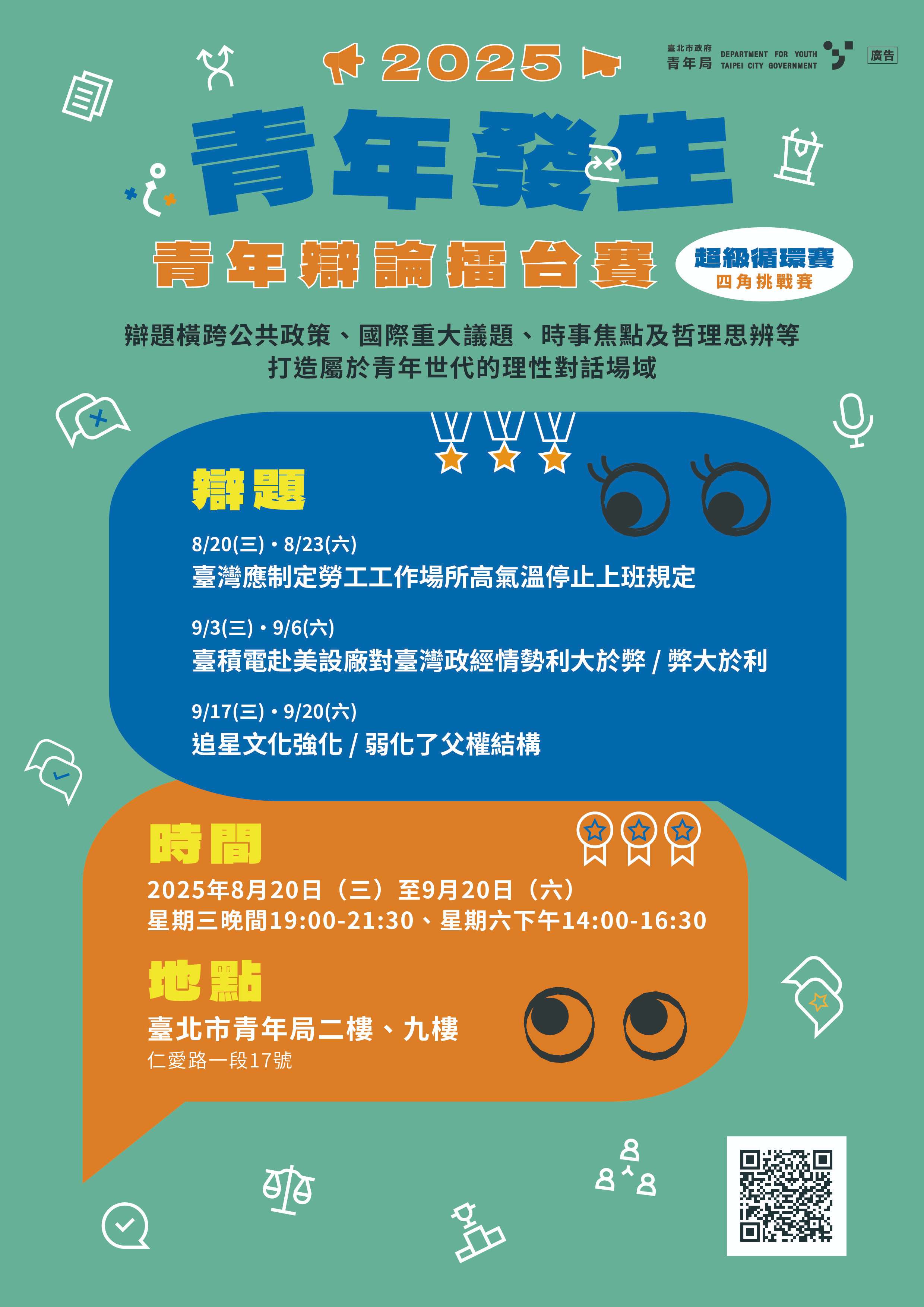 二、本次競賽已於114年(以下同)8月9日、8月10日舉辦前哨戰,確認4支晉級挑戰隊伍,將與具辯論專業、擁有豐富得獎經歷之4支大師隊伍同場競技,本次競賽預計於8月20日 至9月20日間,每隔周之星期三晚間、星期六下午舉辦「超級循環賽」,活動說明如下: (一)活動日期:1、臺灣應制定勞工工作場所高氣溫停止上班規定: (1)8月20日(星期三)19:00-21:30 (2)8月23日(星期六)14:00-16:30 2、台積電赴美設廠對臺灣政經情勢利大於弊/弊大於利 (1)9月3日(星期三)19:00-21:30 (2)9月6日(星期六)14:00-16:30 3、追星文化強化/弱化了父權結構 (1)9月17日(星期三)19:00-21:30 (2)9月20日(星期六)14:00-16:30 (二)活動地點:臺北市政府青年局(臺北市中正區仁愛路一段17號)。 (三)參加對象:關心議題之青年朋友及一般民眾,無須報 名,免費參與觀賽。