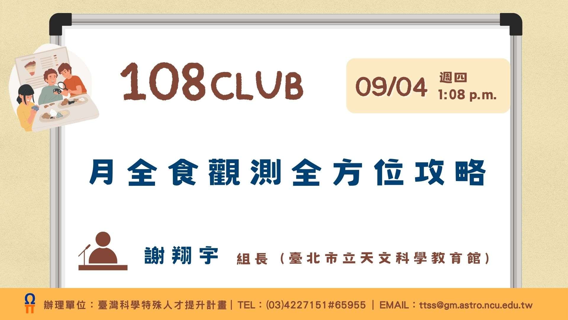 108俱樂部旨在建立一個供教師分享教學經驗與心得的平台,促進專業成長與教育資源交流。本次演講因應9月即將到來的月全食,特邀臺北市立天文科學教育館謝翔宇組長擔任主講,深入分享月全食的觀測方法與準備工作等。