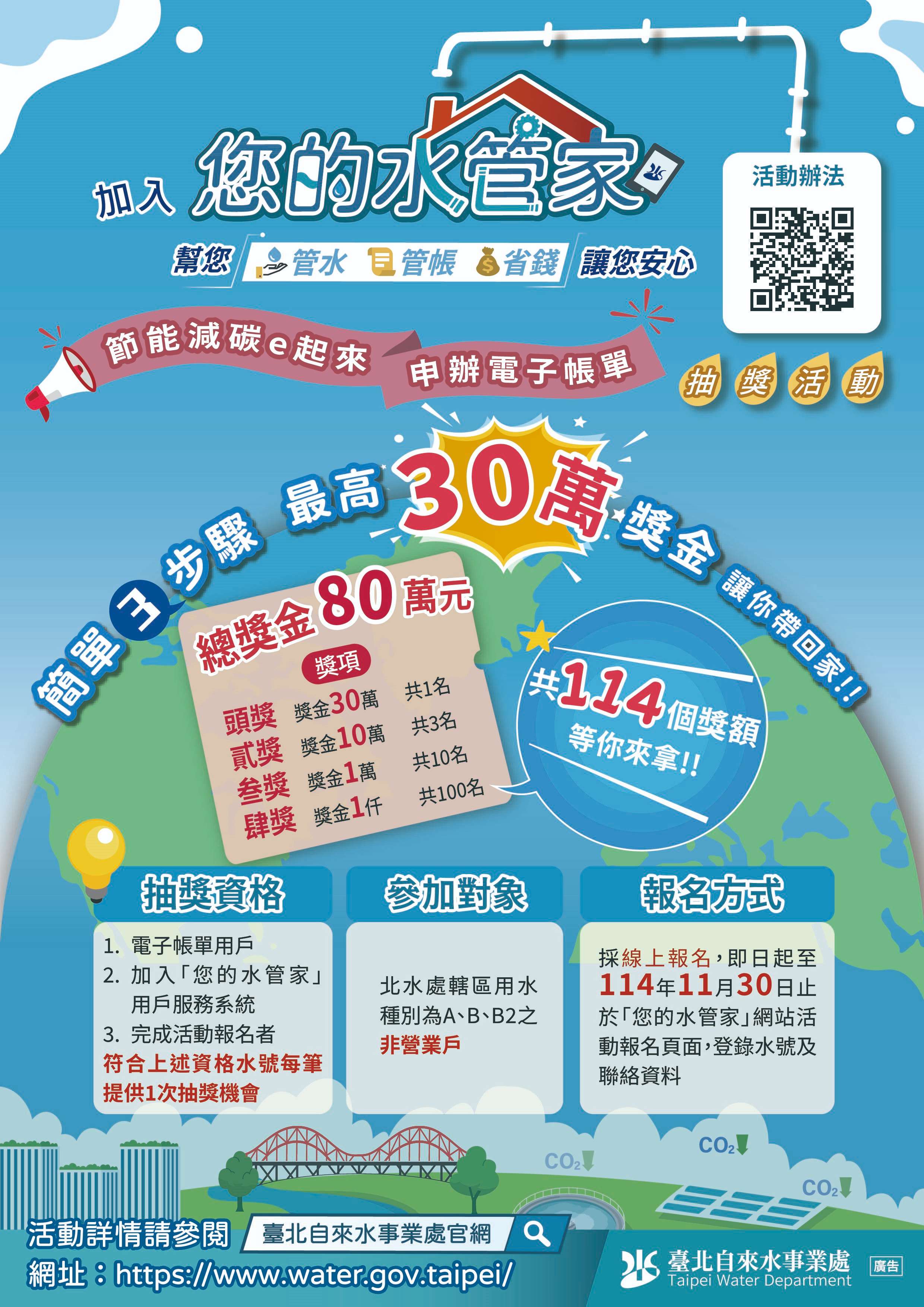 一、本處現正舉辦申辦水費電子帳單抽獎活動,歡迎「北水處 用戶」立即加入或登入「您的水管家」服務系統,申辦電 子帳單並完成活動報名,就有機會抽中30萬大獎!活動期 間自即日起至114年11月30日止【總獎金80萬、共114個獎 額】。