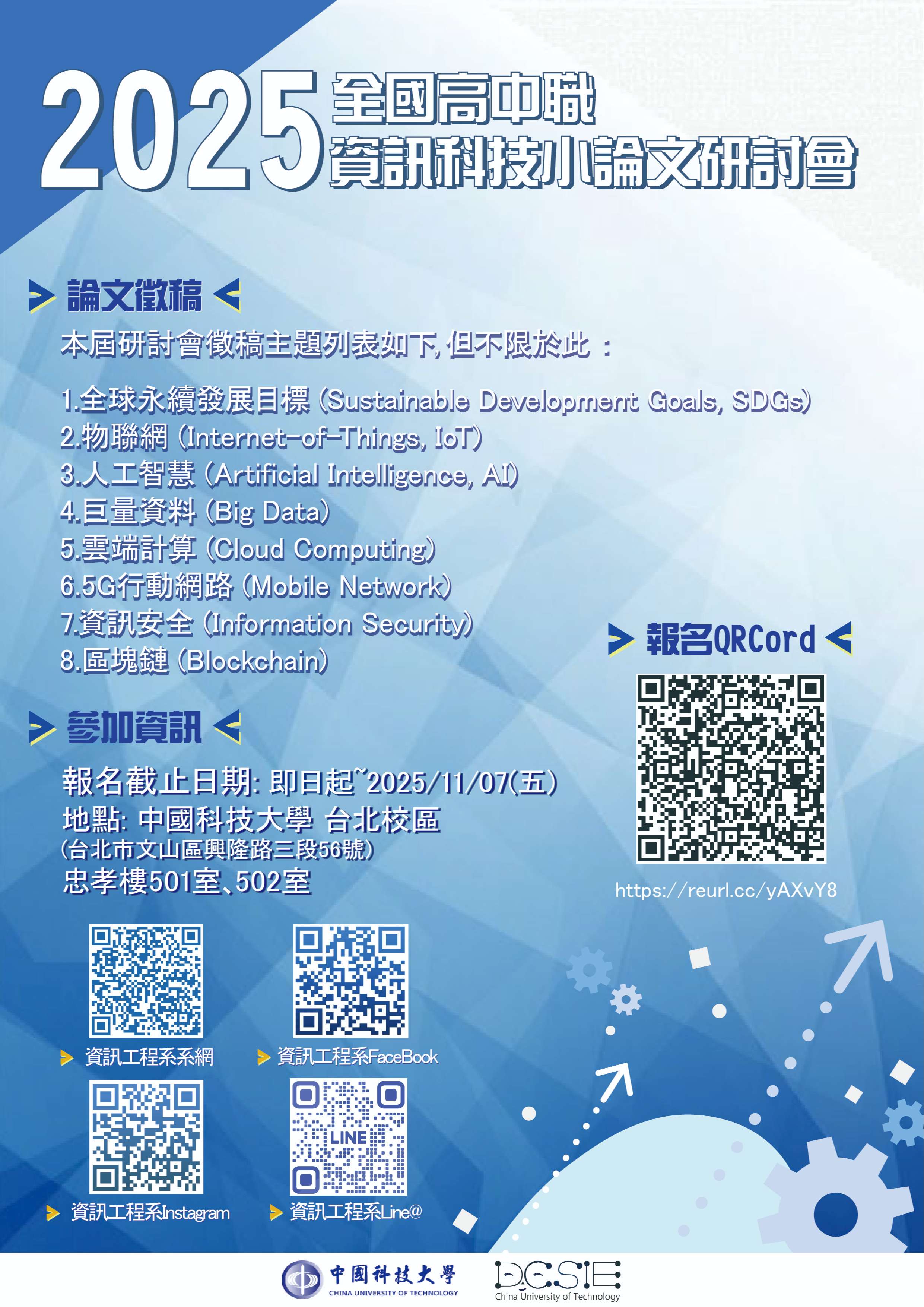 一、為鼓勵高中職學生發揮研究與創新精神,提升學術探究與 表達能力,中國科技大學資訊工程系謹訂於 114年11月15 日星期六,於本校臺北校區舉辦「2025全國高中職小論文 研討會」。