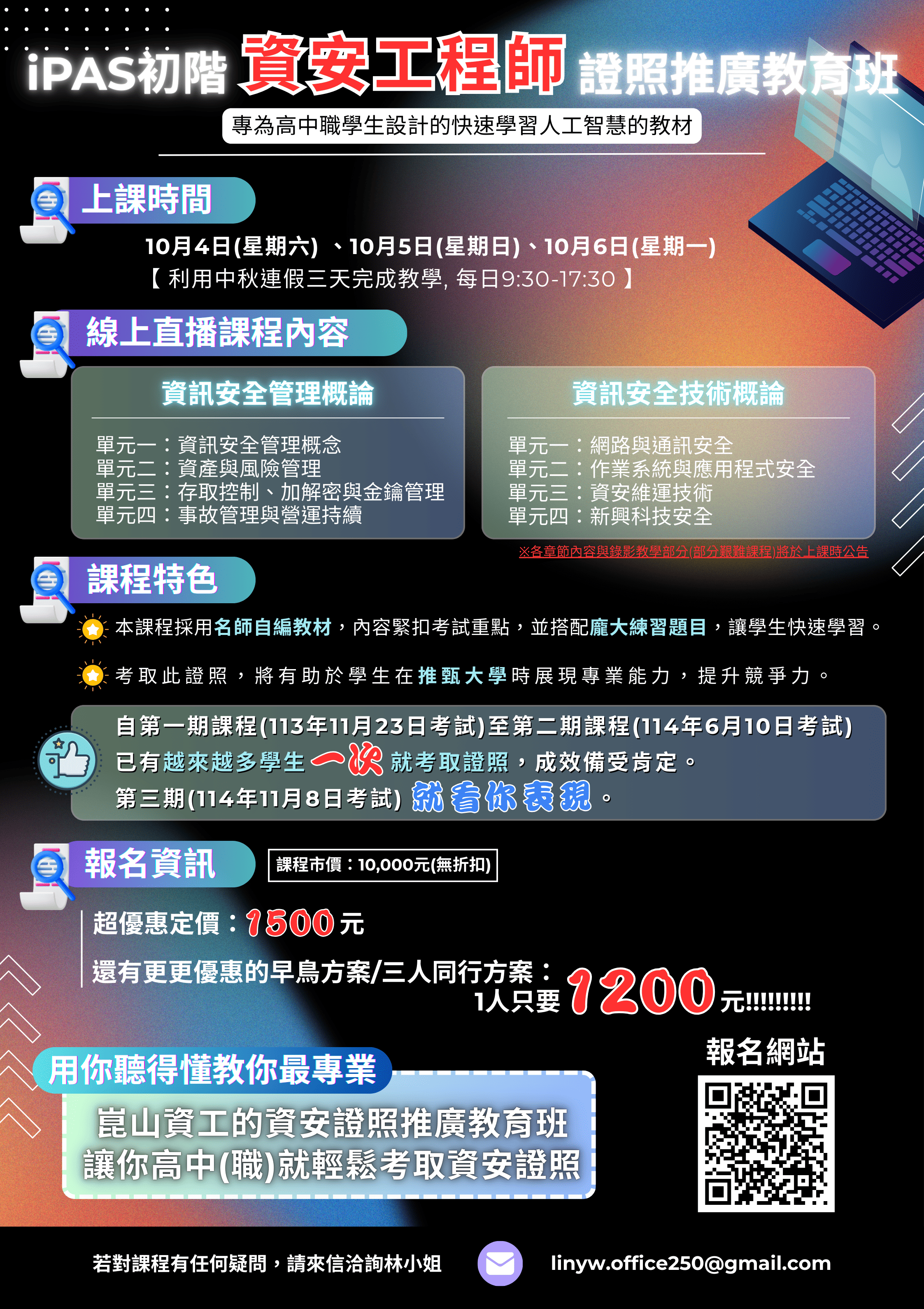 為因應國內資安人才培育需求,崑山科大資訊工程系特開設「iPAS資訊安全工程師(初階)證照班」,協助學生打好資訊安全基礎知識,並取得國家推動之資安證照,課程詳情如下: