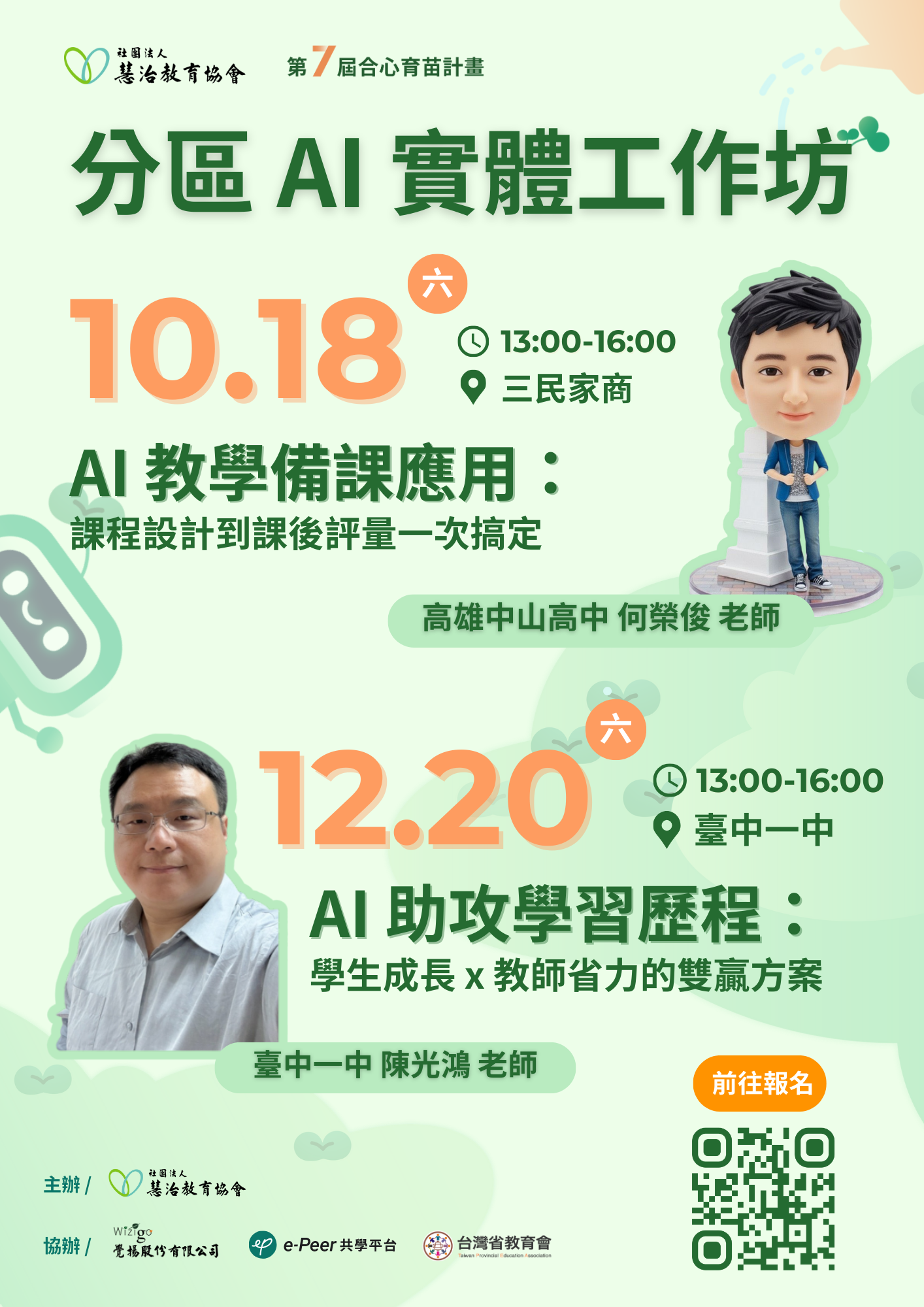 一、108課綱的推動,為奔波於教育現場的高中職教師帶來許多 的挑戰及困難,因此本會與社團法人慧治教育協會聯合辦 理「第七屆合心育苗計畫」,於計畫中辦理北中南東分區 「AI實體工作坊」,透過AI教學經驗分享與實作,增進跨 科教師交流,激發教學靈感;並由專業講師協助教師,將 科技應用與適性引導的教育願景,落實於具體的課程設計 與教學實踐中。