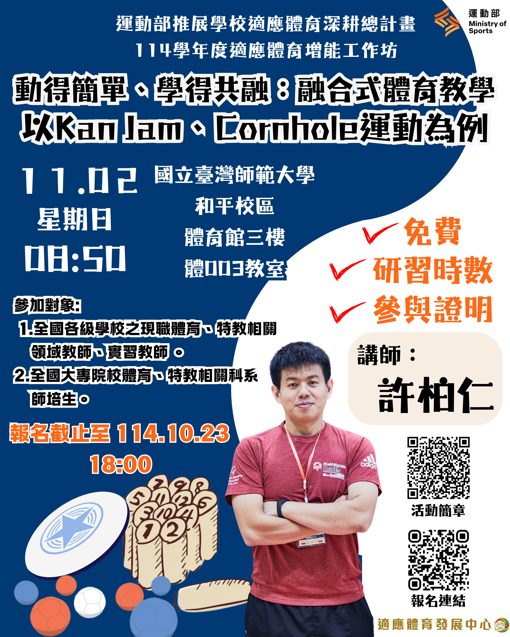動得簡單、學得共融:融合式體育 教學,以Kan Jam、Cornhole運動為例」,請踴躍報名參加。