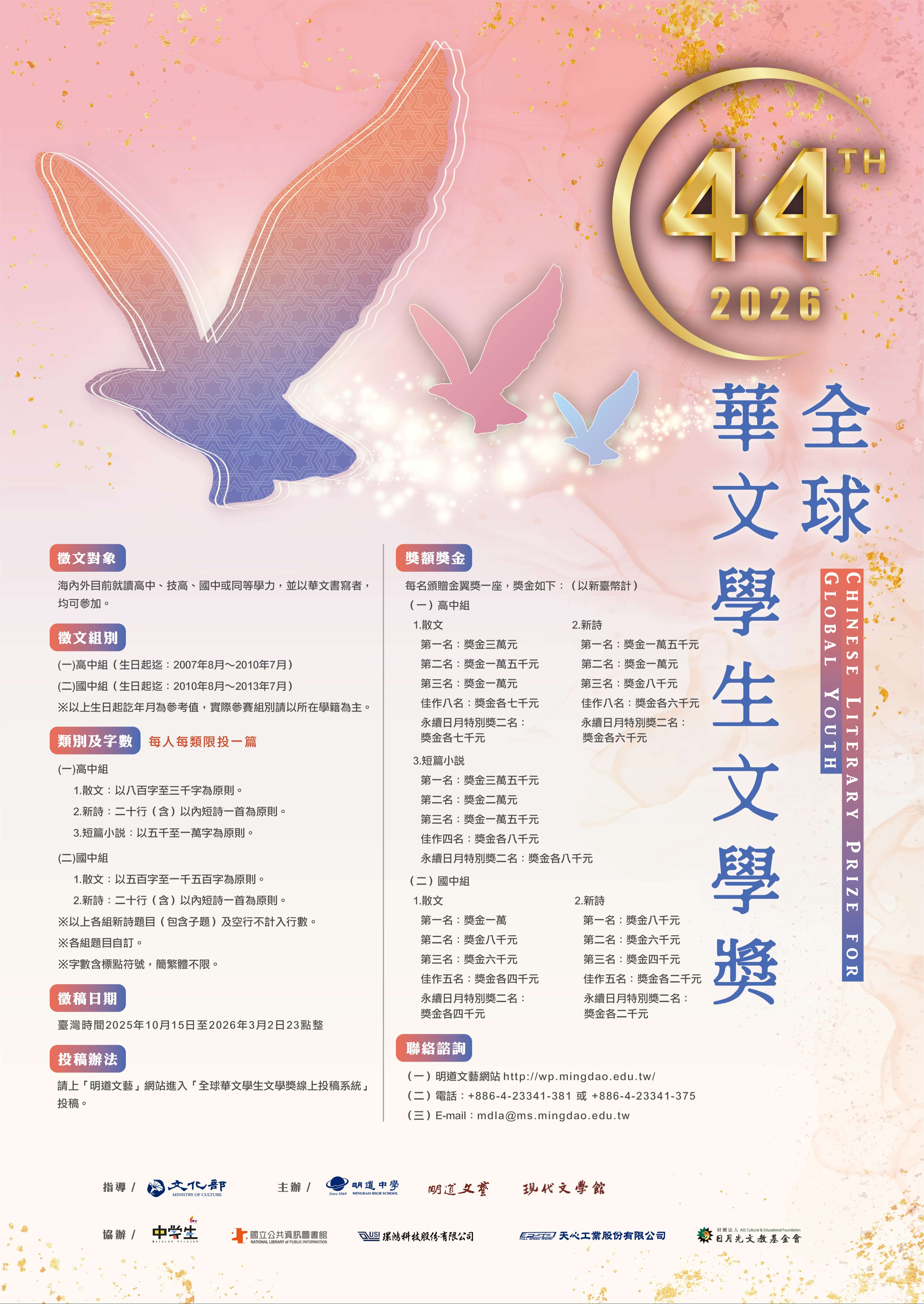 一、「第44屆全球華文學生文學獎」徵文對象為海內外目前就讀高中職、國中或同等學力,並以華文書寫者,均可參加。