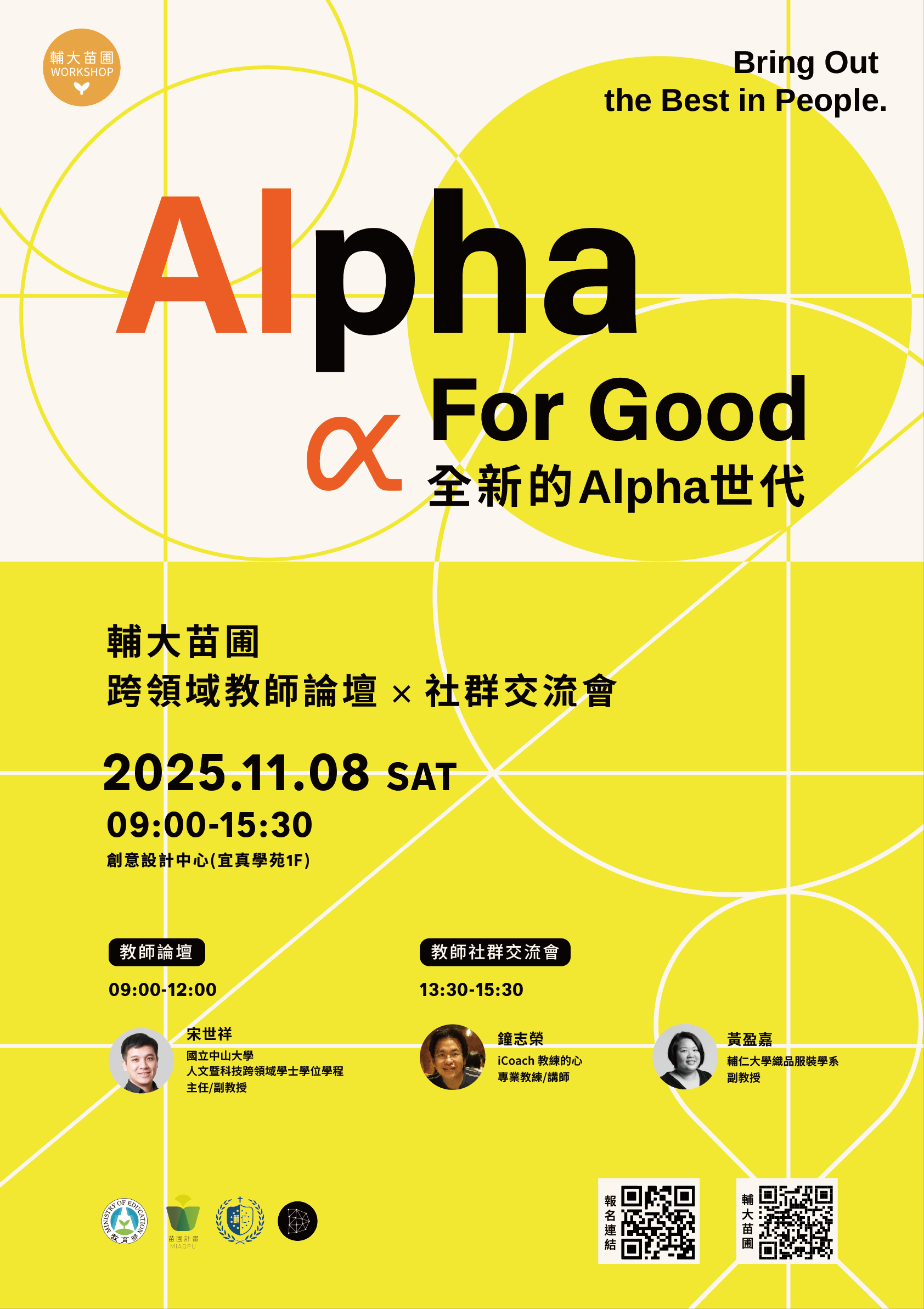轉知輔仁大學謹訂於114年11月8日舉辦教育部跨領域教師發展暨人 才培育計畫輔大苗圃【Alpha For Good:全新的Alpha世 代】跨領域教師論壇&社群交流會