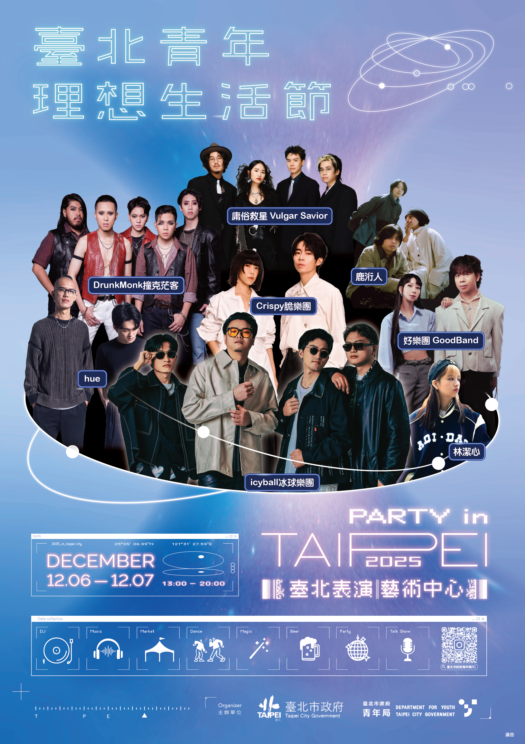 一、為鼓勵青年朋友有更多元的發展及了解青年局政策資源,旨揭活動結合青創市集、主題特展、青年互動展演、脫口秀演出,並邀請知名人氣樂團輪番開唱,打造一場屬於青年世代的年度生活盛典,呈現臺北青年在國際交流、公共參與、職涯探索、創業發展上的多元面貌,邀請所有青年於年末相聚,打造屬於自己的理想生活風景,引導青年朋友描繪未來願景及實踐理想生活。