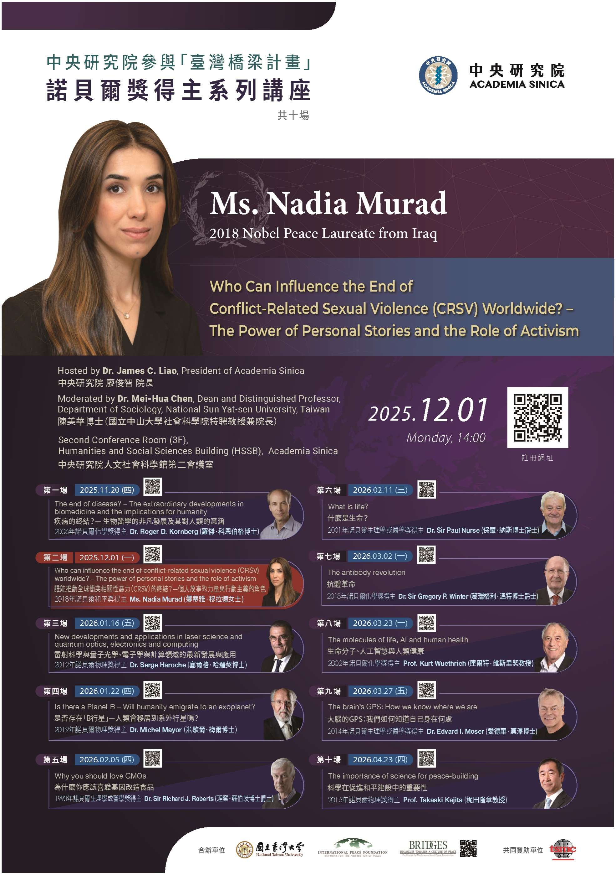一、「臺灣橋梁計畫」自本(114)年11月起至115年4月,共將邀請 31 位諾貝爾獎得主訪問本院及全臺十餘所大學,相 關資訊請參閱網站:https://www.peace-bridges.net/。