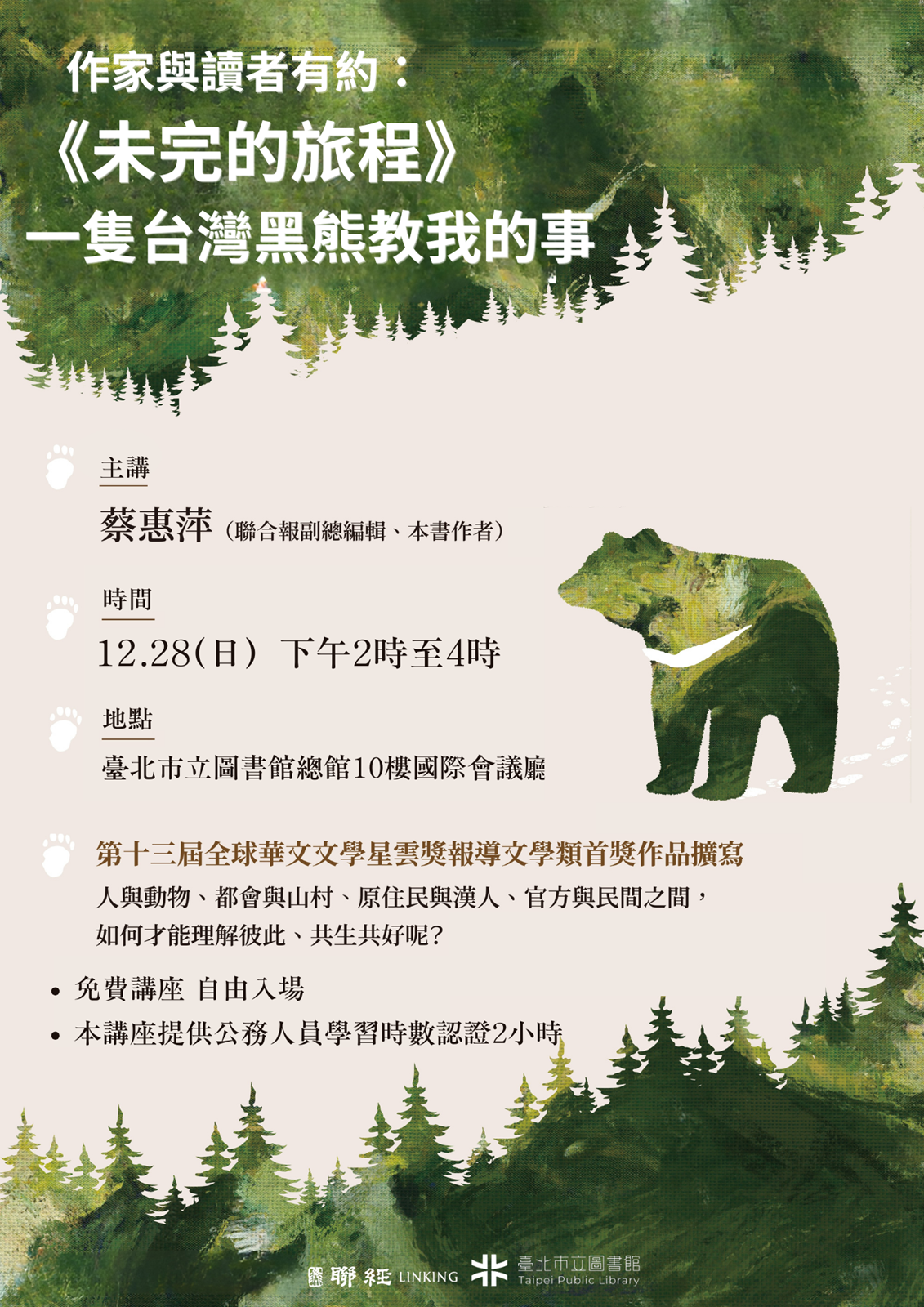 臺北市立圖書館訂於114年12月28日辦理作家與讀者有約講座「《未完的旅程》:一隻台灣黑熊教我的事」: