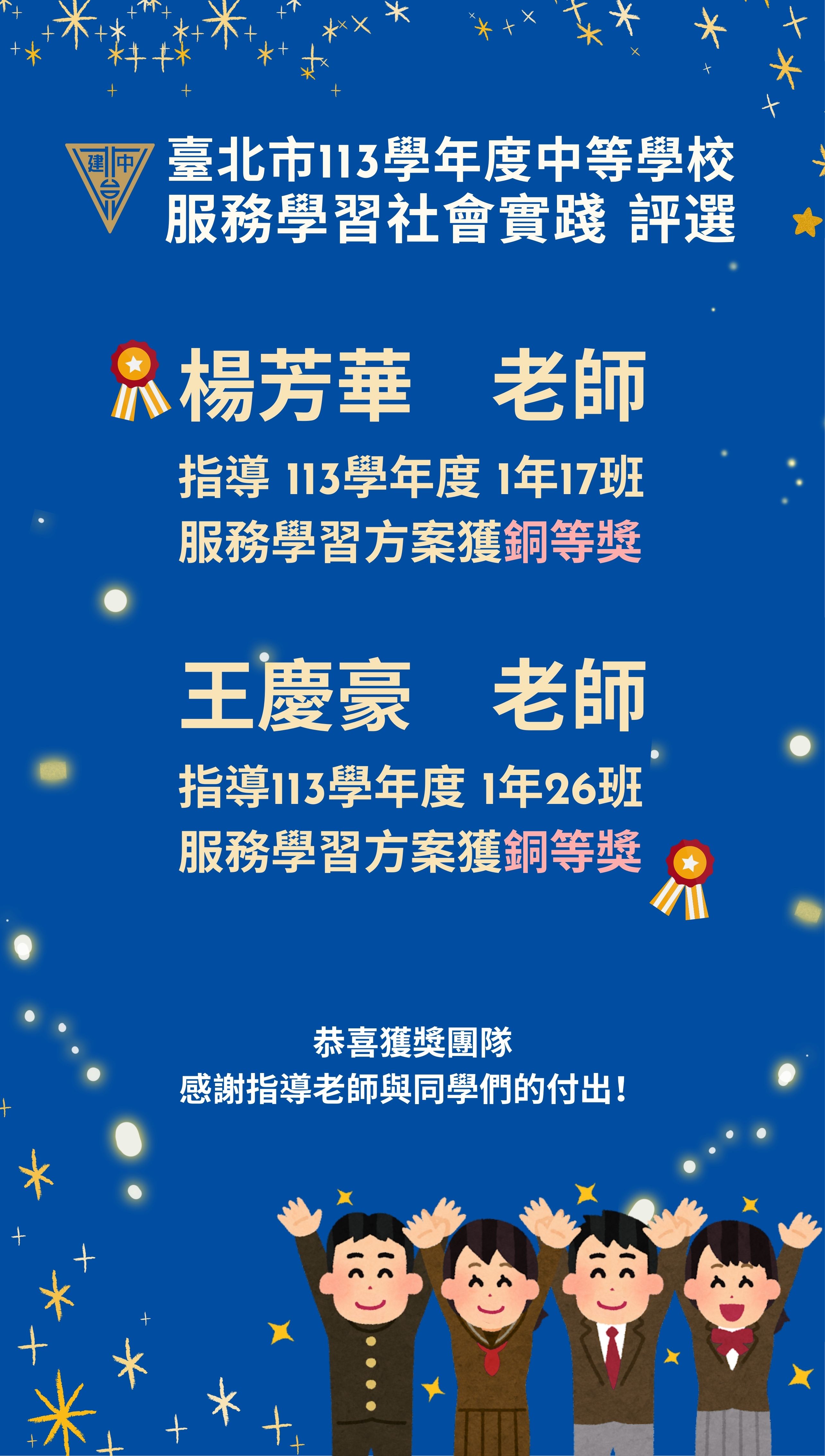 王慶豪老師指導113學年度1年26班(現226班)服務學習方案獲銅等獎。