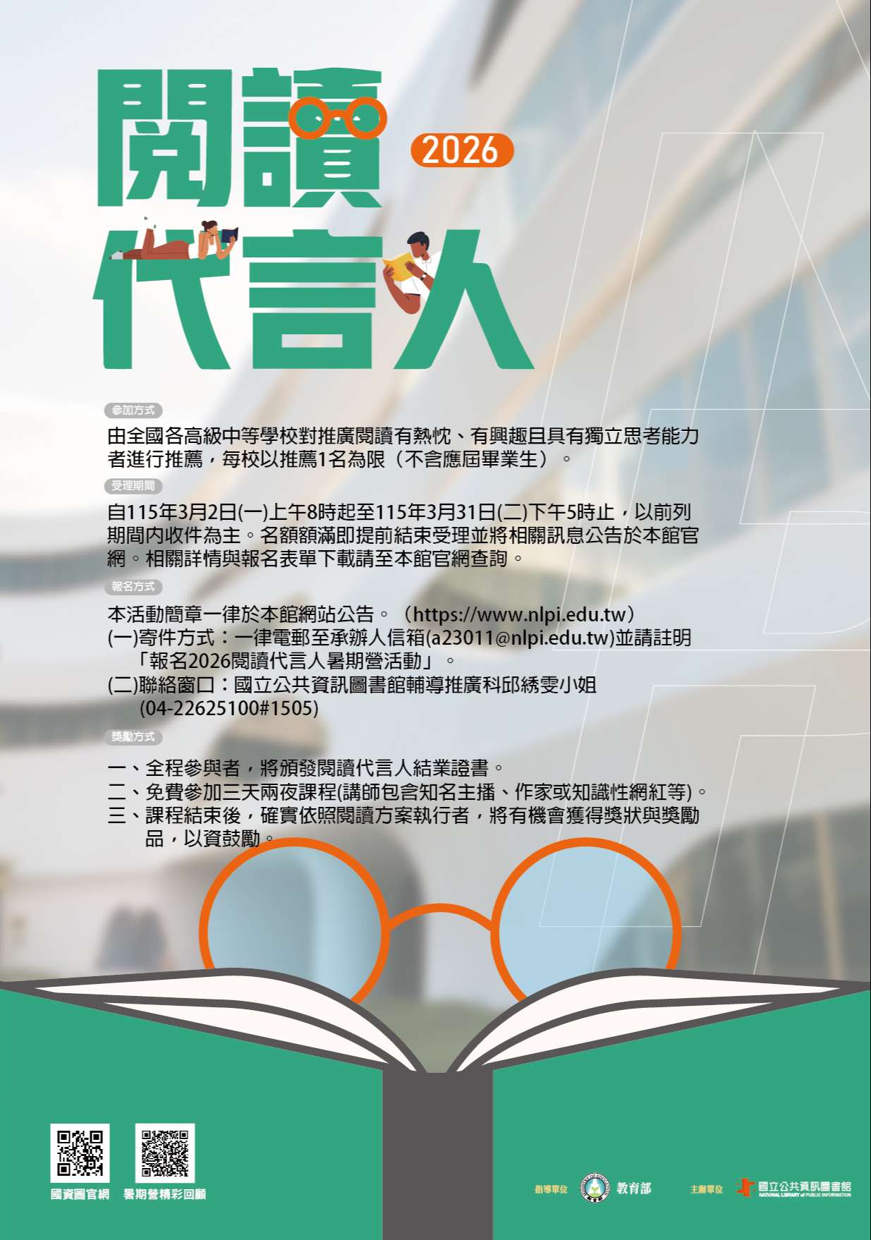 五、檢送活動簡章與海報各1份,相關詳情請參閱附件或逕至本館網站(https://www.nlpi.edu.tw)下載及查詢,如有更動以本館官網公告為主。