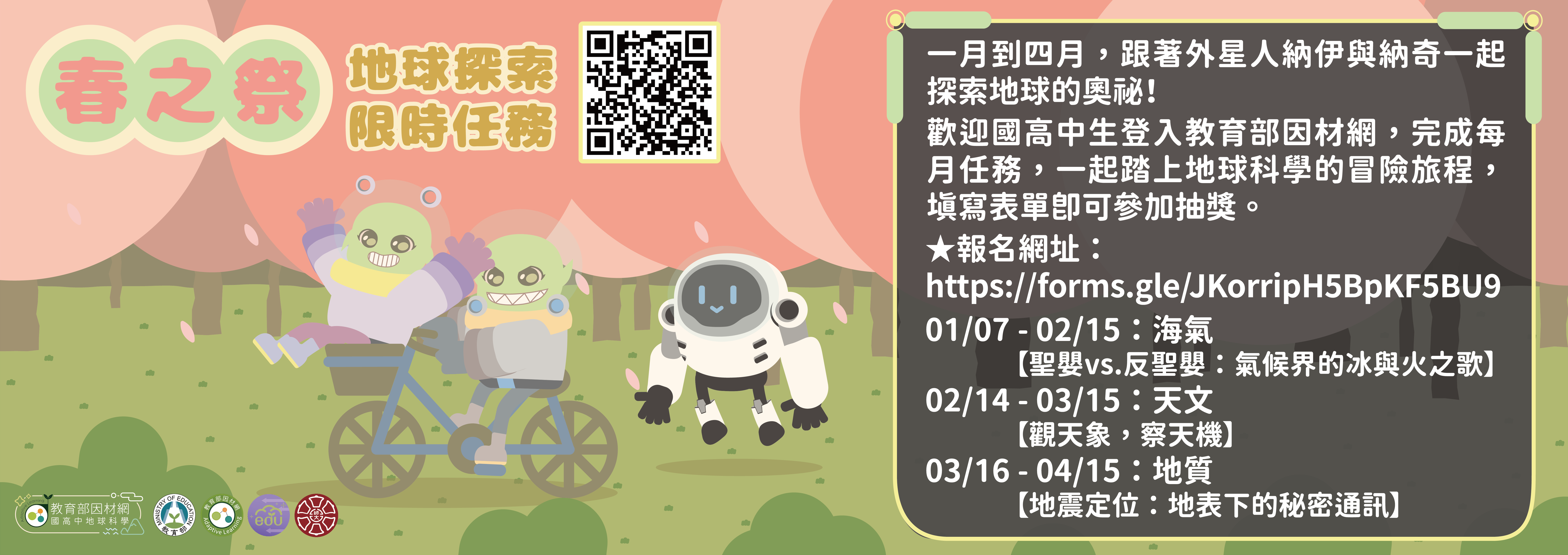 自115年1月7日起至115年4月15日特辦理「春之祭——地球探索限時任務」跨校學習活動,於期限內完成報名之國中及高中職學生即有機會參加科學好禮抽獎,歡迎學生踴躍參加。
