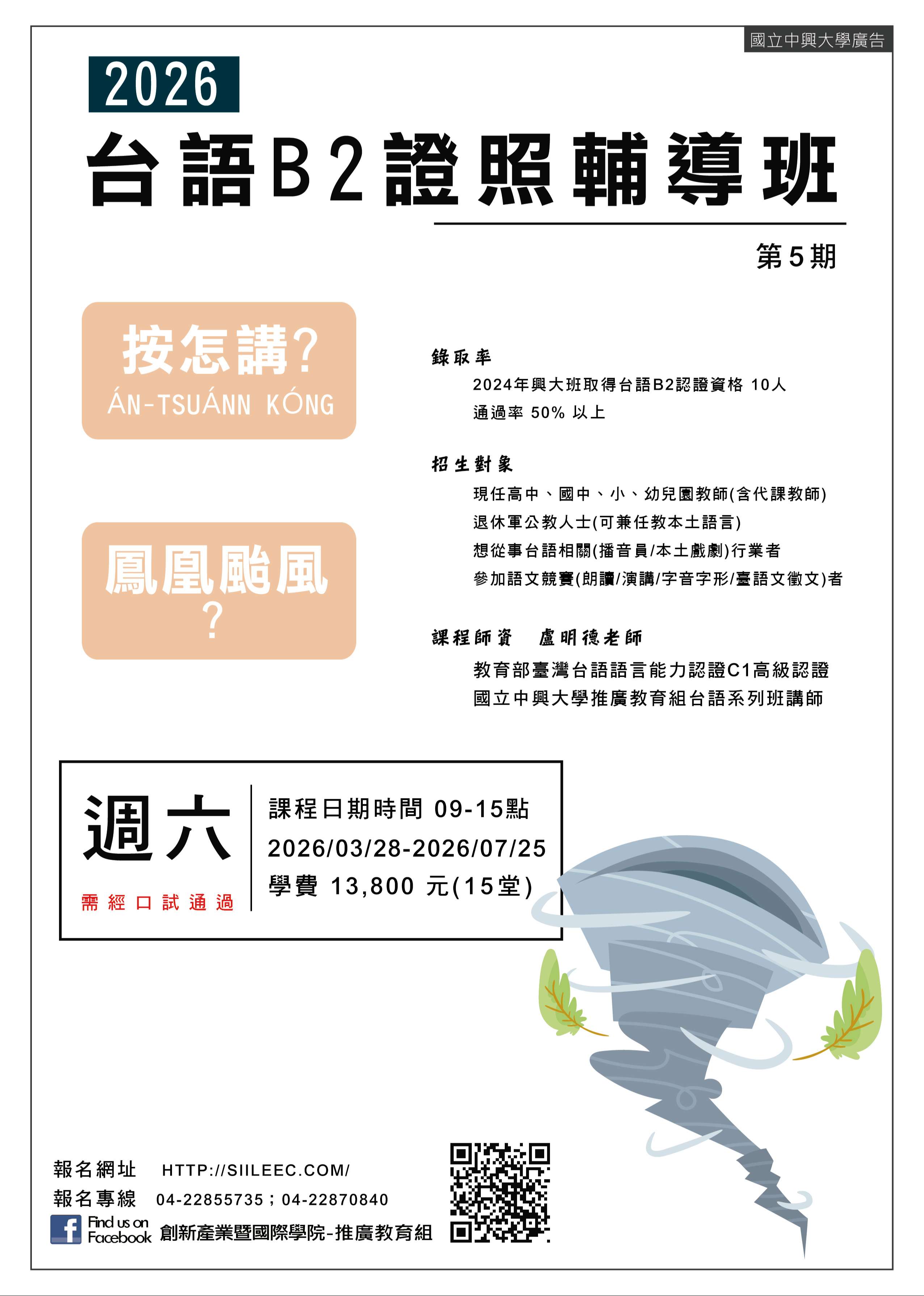 (一)台語B2證照輔導班第4期,2026/03/28-2026/07/25,每 週六9-15點,共15次,優惠價13,800元(不含教材與午 餐)。 地點:國立中興大學綜合大樓7樓722室。