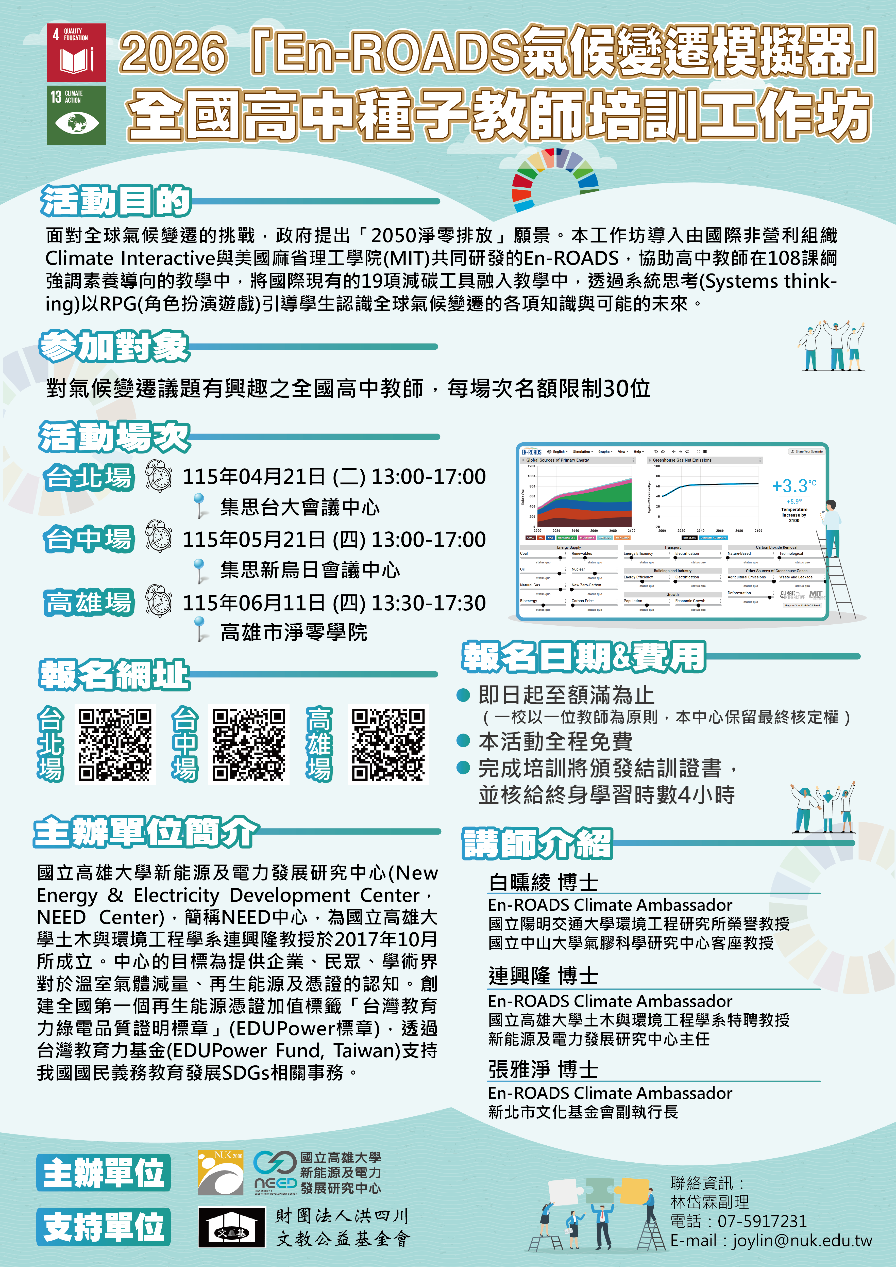 國立高雄大學新能源及電力發展研究中心將辦理2026「En-ROADS氣候變遷模擬器」全國高中種子教師培訓工作坊,協助高中教師在108課綱強調素養導向的教學中,將國際現有的19項減碳工具融入教學中,透過系統思考及以角色扮演遊戲,引導學生認識全球氣候變遷的各項知識與可