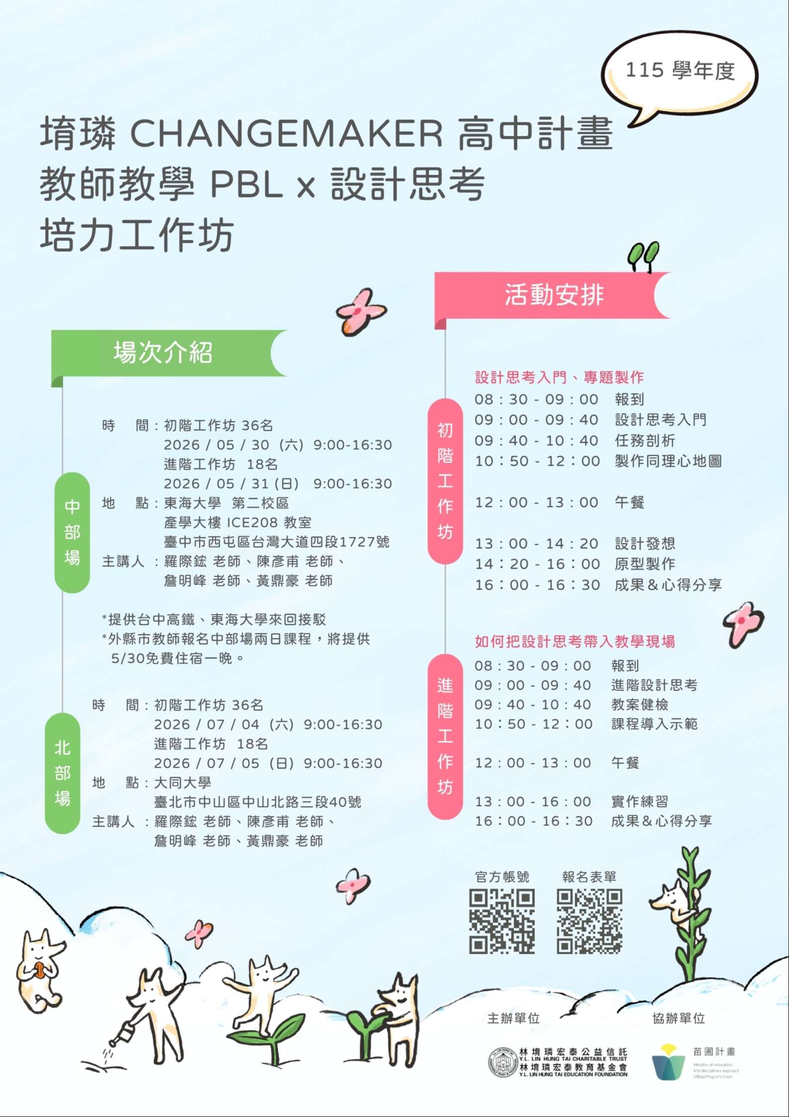 一、旨案工作坊係「堉璘 CHANGEMAKER 高中計畫」之一環,旨 在協助教師因應108課綱推動下之課程設計與教學轉型需求,透過結合設計思考與問題導向學習,引導教師理解專題式學習之實施流程,並發展可實際應用於課堂之教學設 計;課程分為初階體驗與進階實作兩階段,期盼能提升教師課程設計能力,並促進學生學習動機與問題解決能力之培養。