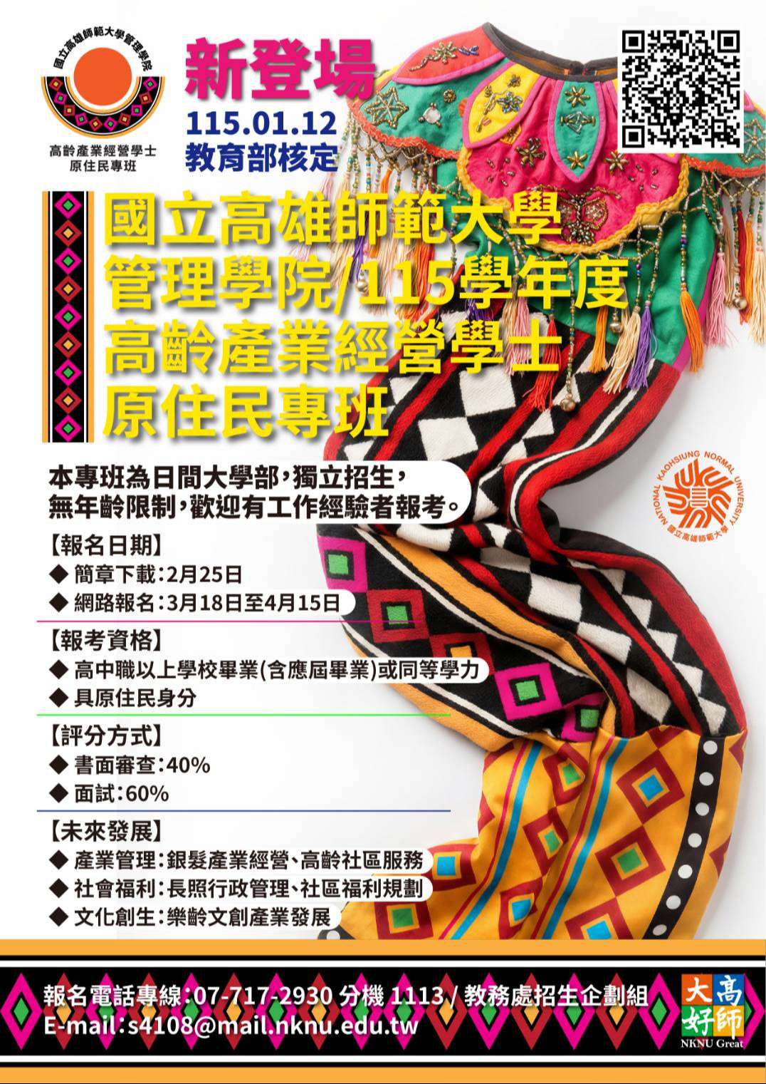 【115升學】115高齡產業經營學士原住民專班招生資訊_國立高雄師範大學