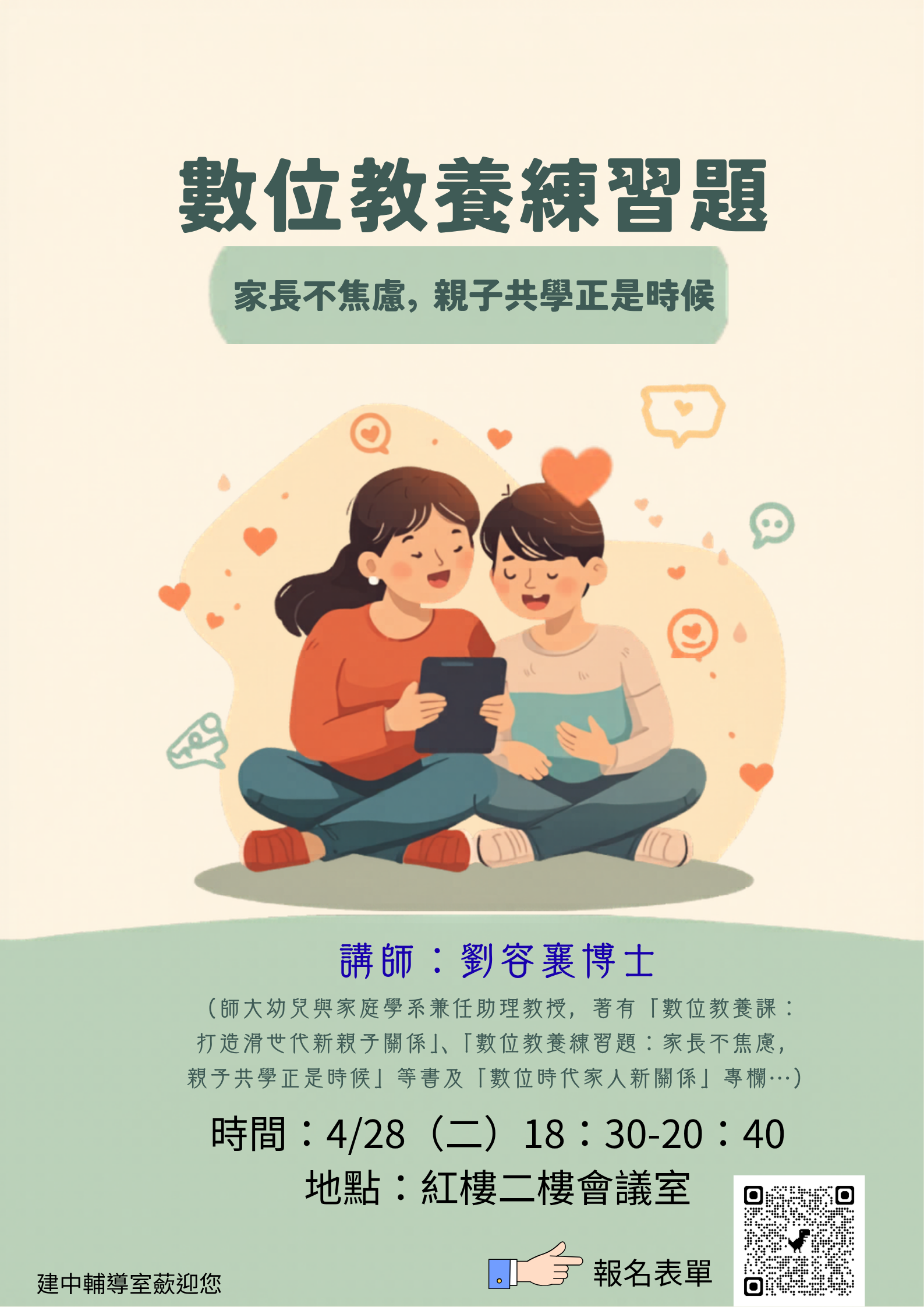 二、講師:劉容襄博士(師大幼兒與家庭學系兼任助理教授,著有「數位教養課:打造滑世代新親子關係」、「數位教養練習題:家長不焦慮,親子共學正是時候」等書及「數位時代家人新關係」專欄…)