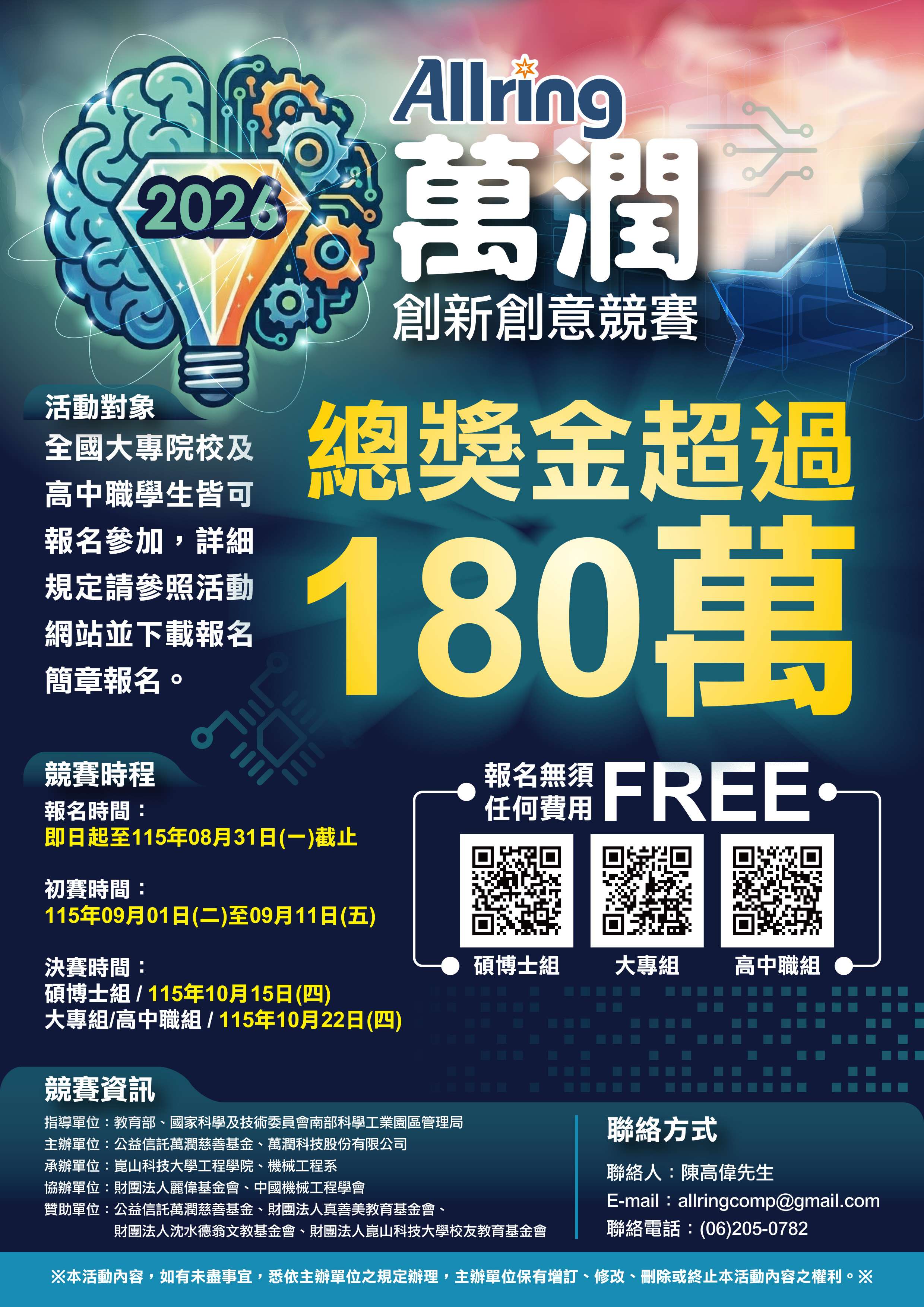 崑山科技大學辦理「萬潤2026創新創意競賽- (高中職組)」,以提升學生專業及創新能力,激發創造潛能, 開發電機資訊、AI智慧系統、工程應用等相關創意應用, 透過競賽辦理,經由各式創意發想製作成品參與競賽,提 升學生創新創意及專利申請興趣,進而提升國際競爭力。報名時間為即日至115年08月31日止受理報名。 歡迎學生報名參加,詳細資訊請見附件檔案,謝謝~