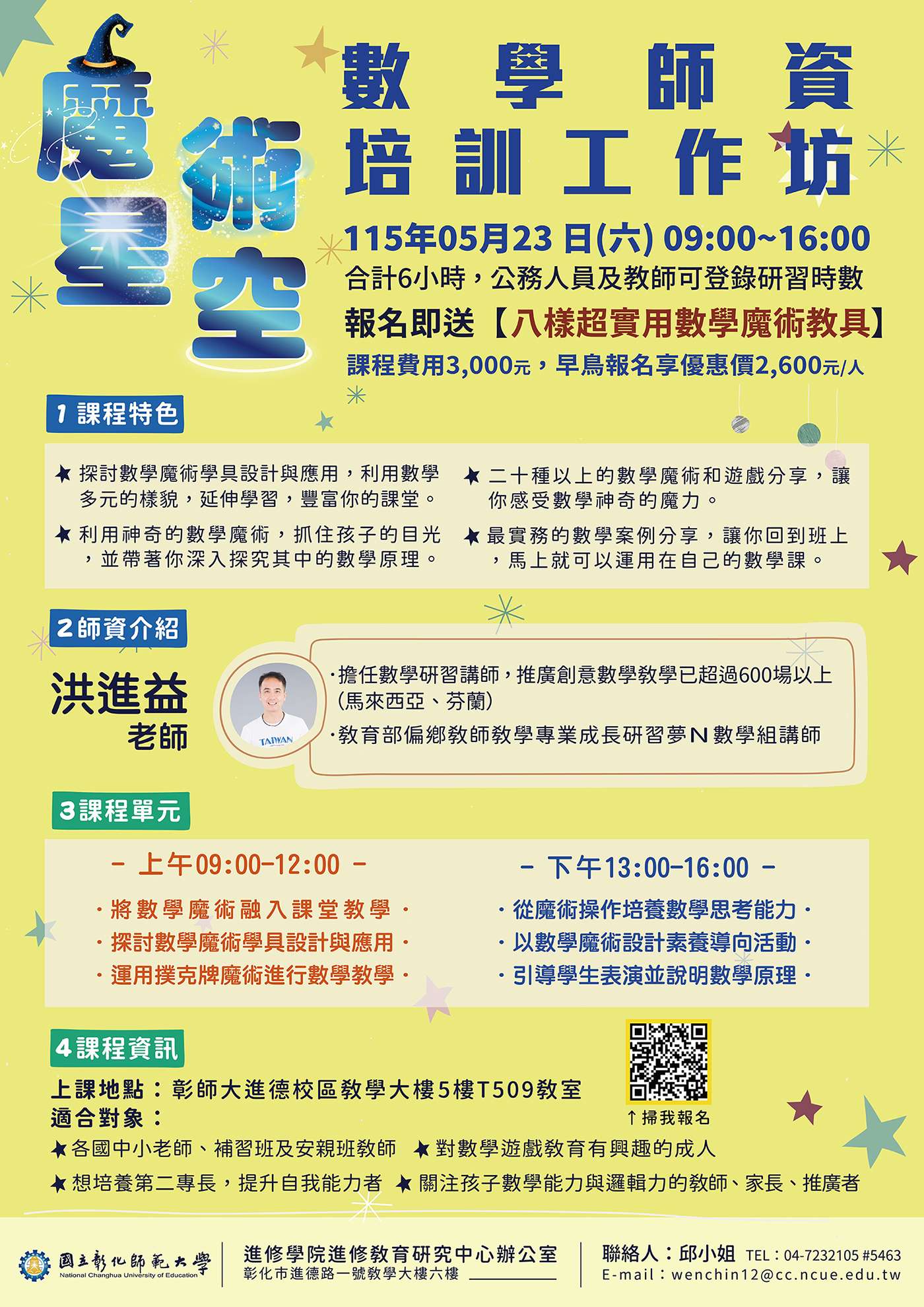 (三)課程費用:3,000元(含教材費-報名即送八樣超實用數 學魔數教具)。早鳥報名享優惠2,600元。