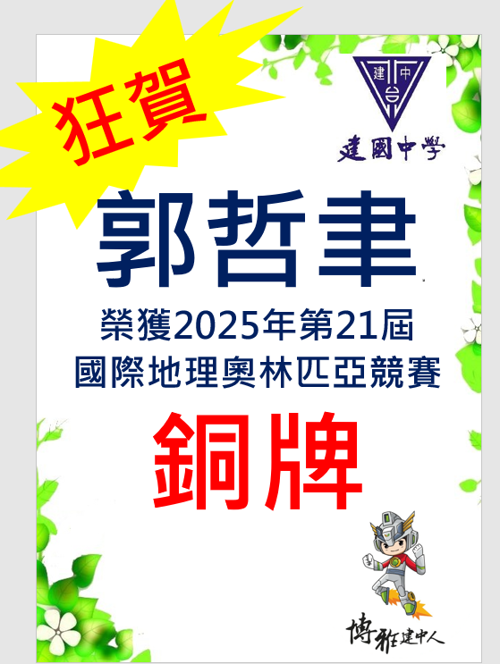 恭喜!!!本校陳允陞同學、郭哲聿同學參加2025年第21屆國際地理奧林匹亞競賽榮獲一銀一銅佳績。
