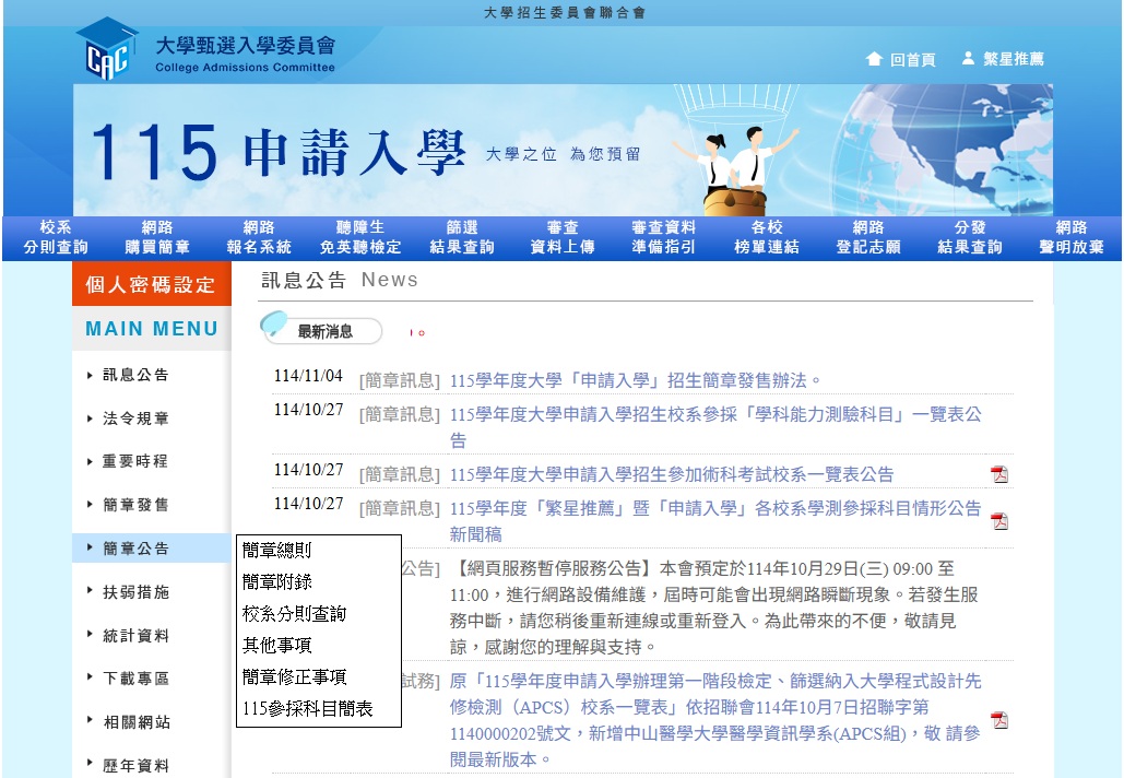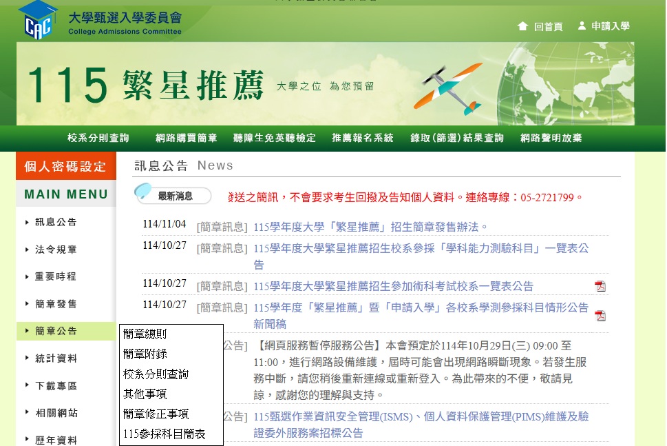 大學招生委員會聯合會公告:115學年度大學繁星推薦、申請入學、分發入學三招生管道簡章及相關重要資訊