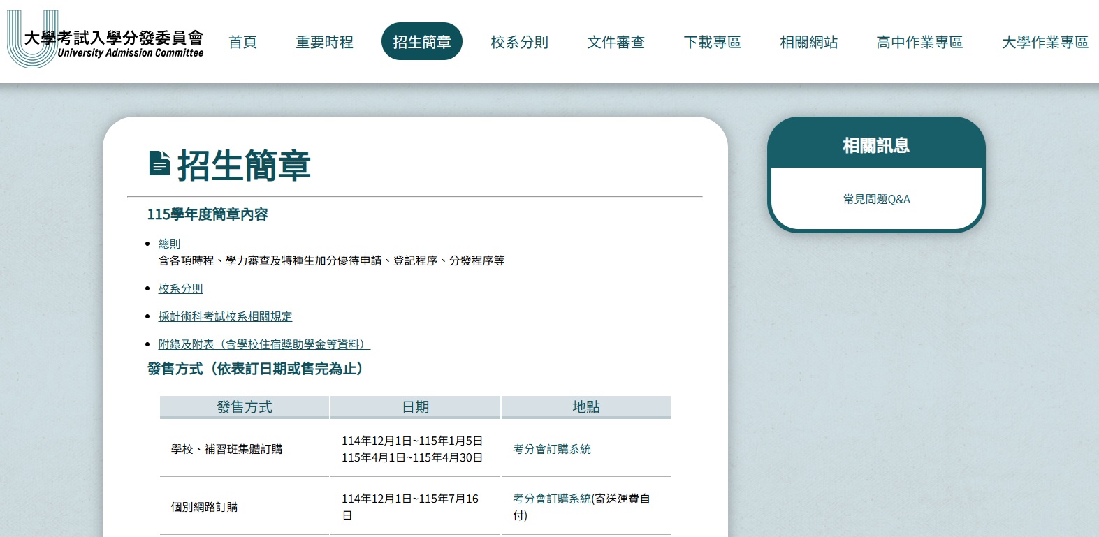 分發入學連結即可查詢簡章公告內容及校系分則
